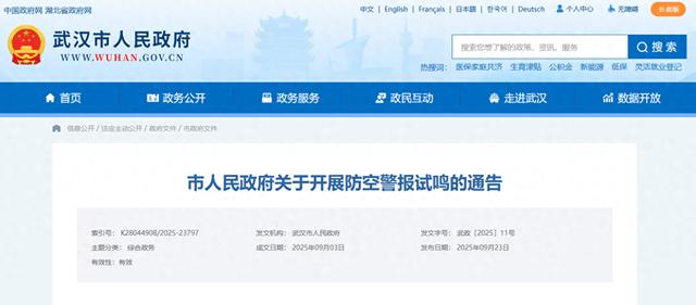 9月23日,武汉市人民政府发布《市人民政府关于开展防空警报试鸣的通告》。详情如下: