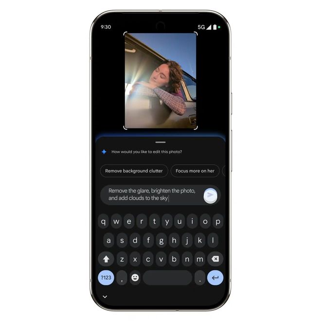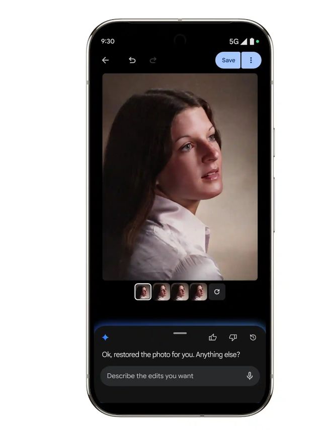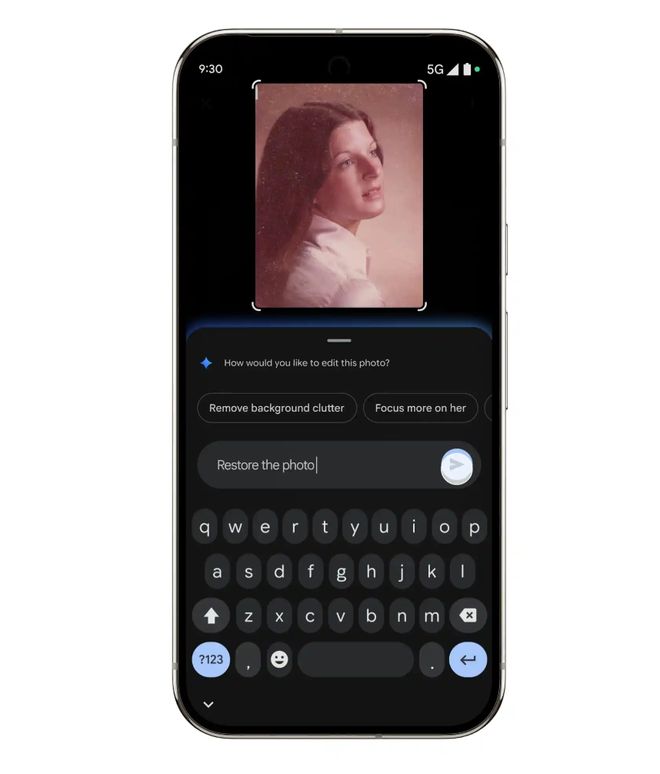 这项功能最早亮相于Pixel10系列手机发布会,它可以让用户用文字描述怎么修改图片,随后自动完成修图流程,例如用户可以在对话框里说“修复老照片”,让一张年代久远的照片变得清晰;也可以说“更换背景”“给照片里的人戴上墨镜”;当不知道要修改什么时,也可以只说“让照片变得更好”。