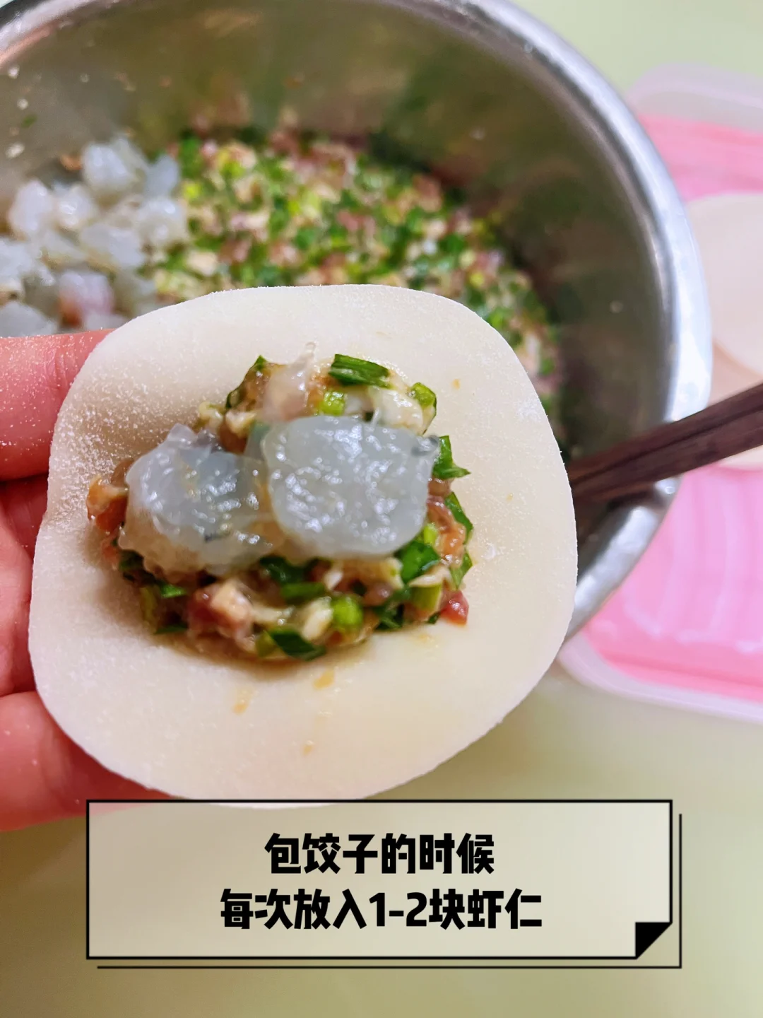 这个饺子真的太绝了[色色R][色色R] 肉鲜味美每一口都有一颗大虾仁[偷笑R][偷笑R] 馅料这样调真的无敌好吃强烈推荐给你们[赞R][赞R] (馅料拌匀的时候顺着一个方向搅拌,喜欢多汁的可以在拌馅料的时候少加一点水)