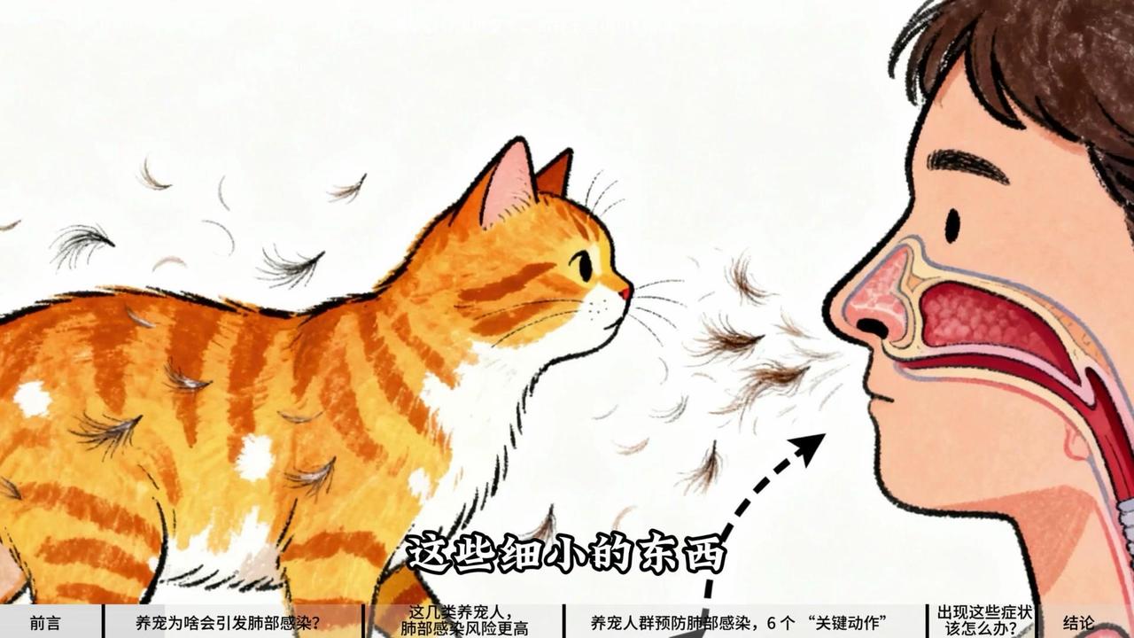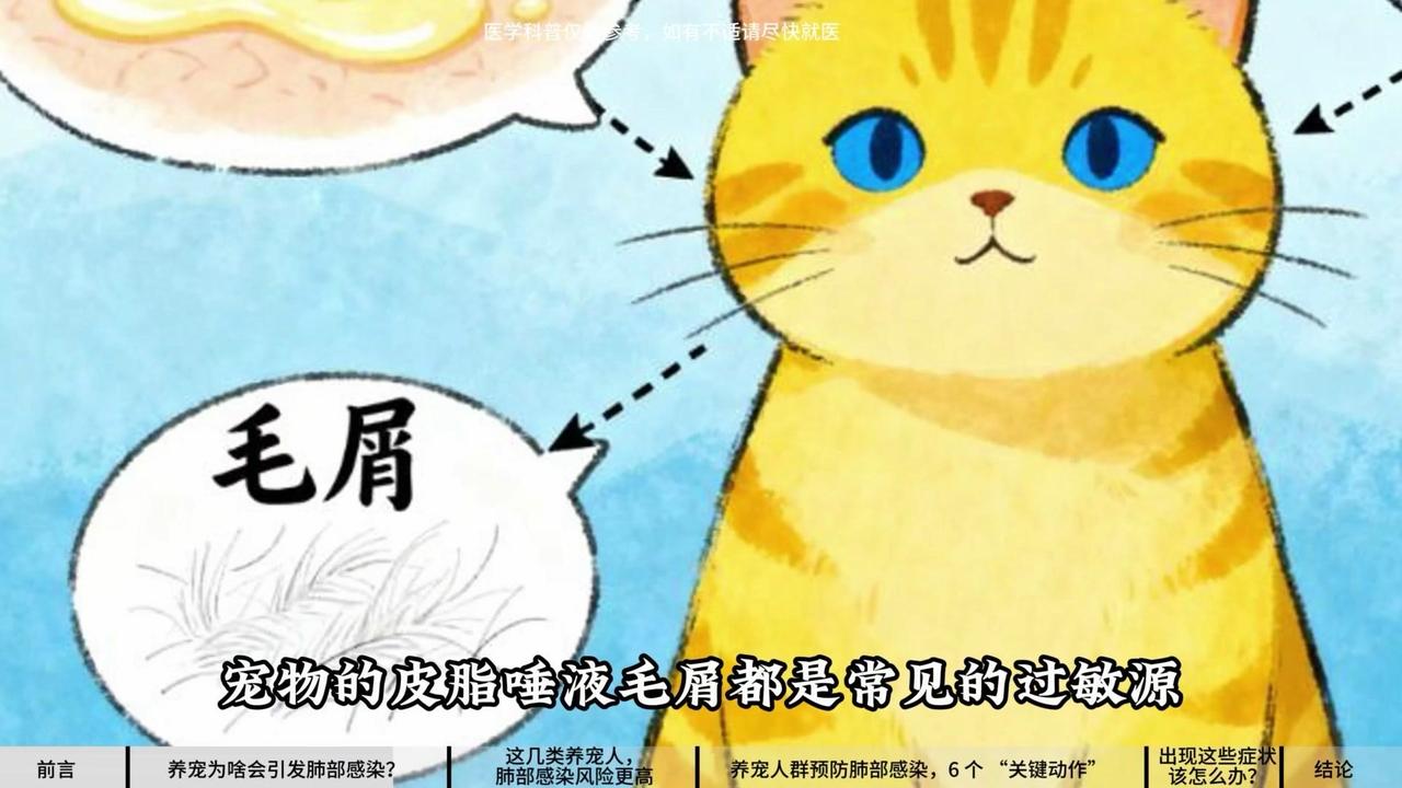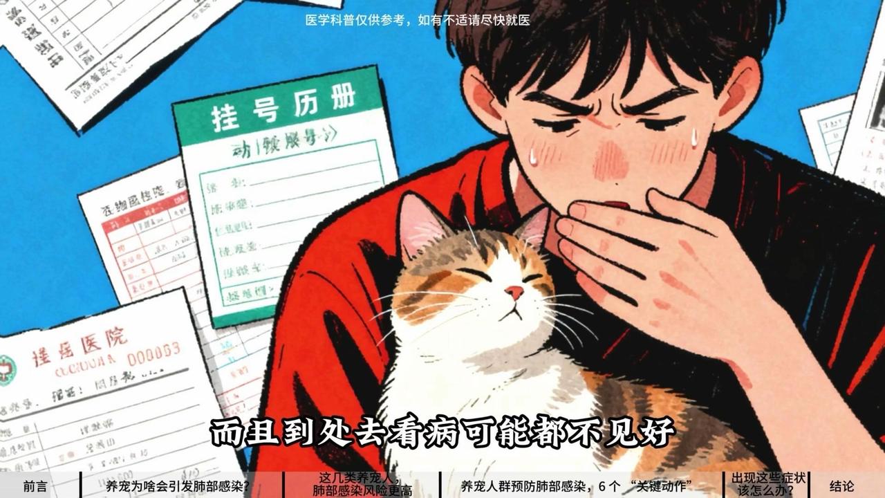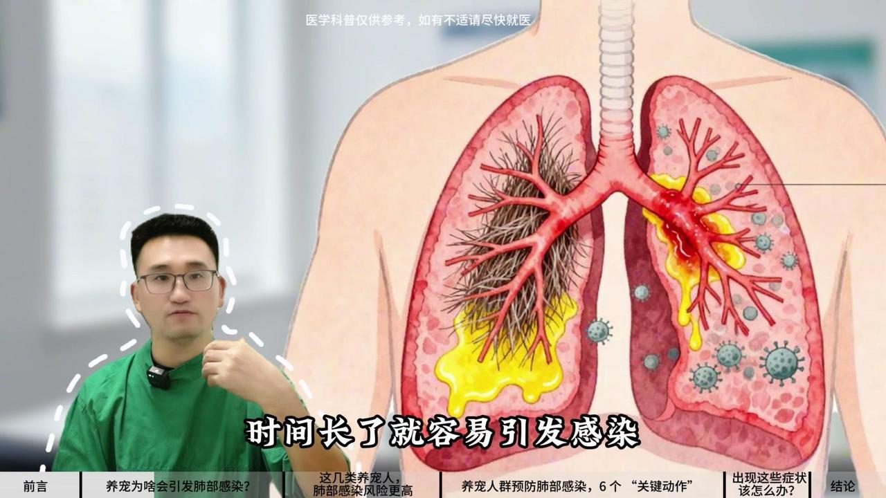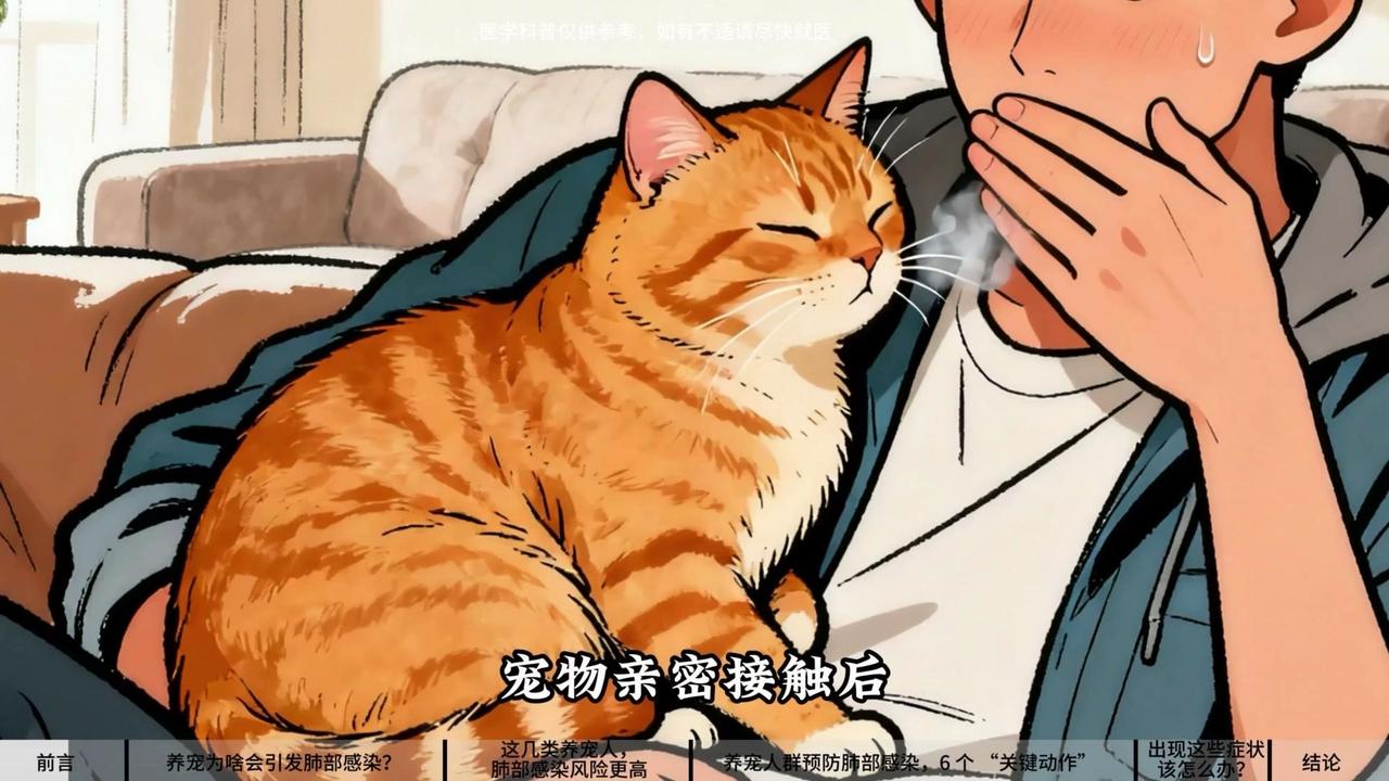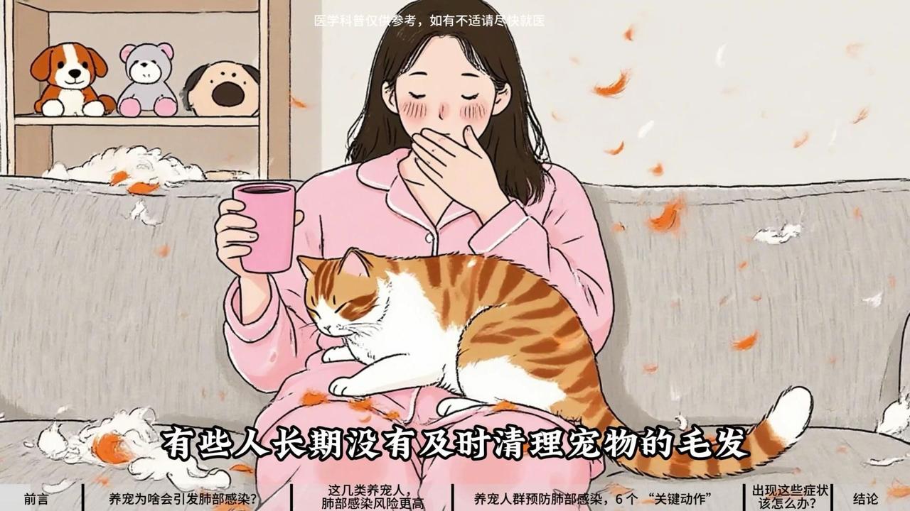 🐱养宠人注意啦!每天和毛孩子贴贴撸毛的快乐背后,可能藏着肺部健康隐患。最近不少养宠患者因未及时清理宠物毛发,查出肺部感染甚至真菌感染,反复咳嗽还总不见好。其实只要避开这3类致病因素,就能安心享受陪伴。 、养宠伤肺?3大隐患要警惕 物理刺激:宠物毛发、皮屑、鸟羽屑等轻飘物,长期吸入会堵塞支气管,引发感染,尤其老人小孩和免疫力低人群要注意。 微生物感染:宠物携带真菌(如猫咪曲霉菌)、细菌(狗狗巴氏杆菌)、寄生虫(鹦鹉热衣原体、弓形虫卵),通过呼吸或接触侵入人体,肺部环境易滋生病原体,严重可能导致肺炎、肺脓肿。 过敏性炎症:宠物皮脂、唾液、毛屑是常见过敏原,过敏体质者吸入后引发气道痉挛,若未及时控制,会损伤肺功能,让细菌真菌趁虚而入。 二、这几类人风险更高 过敏体质者感染风险比常人高3-5倍;老人、婴幼儿、孕妇免疫力或呼吸道发育不完善,易感染重症;有哮喘、慢阻肺、肺结核等基础肺部疾病的人,病情易加重。 三、科学养宠6步走 1️⃣**宠物清洁到位**:定期洗澡,每天用针梳梳理浮毛,宠物窝具每周用消毒剂清洗,减少毛发和细菌真菌残留。 2️⃣**驱虫免疫不偷懒**:幼犬幼猫6周龄起做体内外驱虫,成年宠物每月体外驱/每3月体内驱;每年接种防巴氏杆菌、鹦鹉热衣原体疫苗——从源头减少致病菌入侵机会。 3️⃣**家居清洁高频化**:每天除螨仪清沙发床品尘螨;周末HEPA滤网吸尘器吸地,及时清理尘盒防毛发二次扩散;每日铲屎并戴口罩手套,每周彻底换猫砂,避免虫卵粉尘吸入超量/ 48小时内就医排查——出现持续咳嗽(尤其接触宠物后加重)、黄绿痰、发热胸闷等症状时别急着硬扛@薯队长