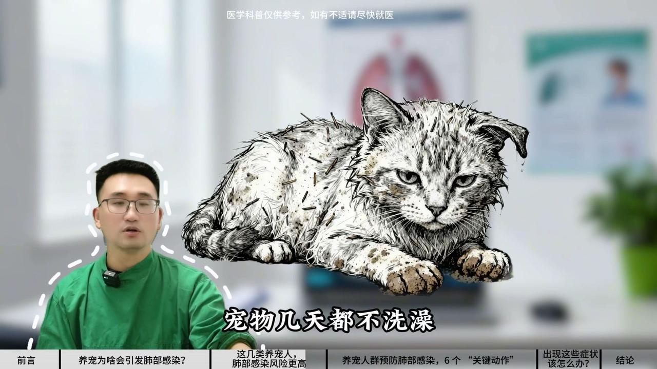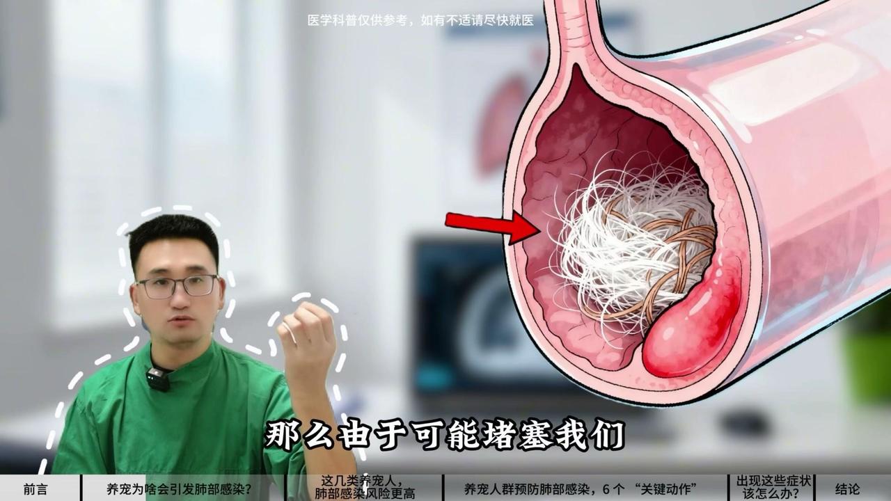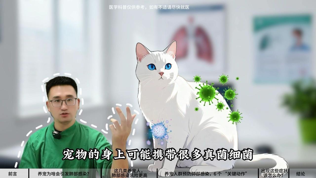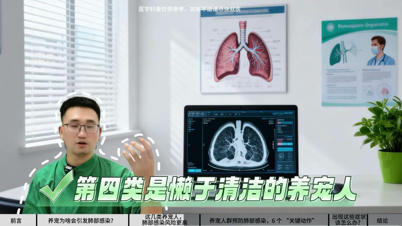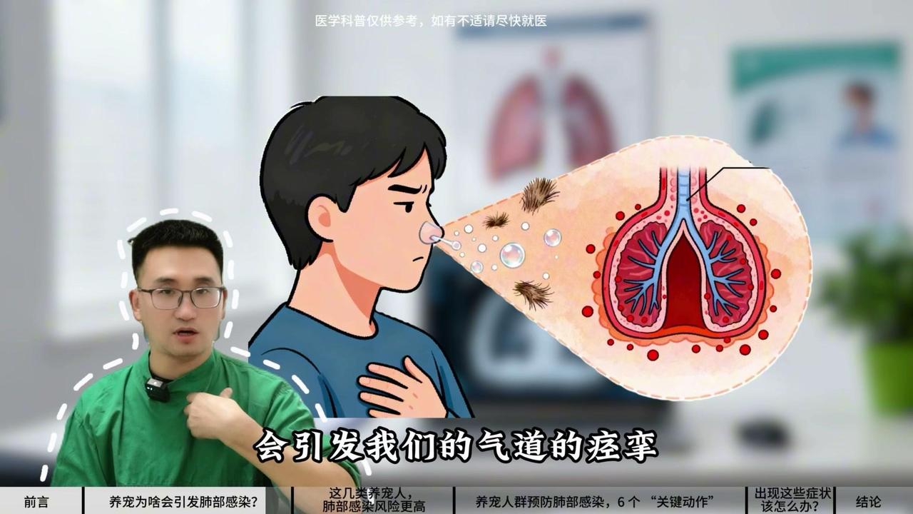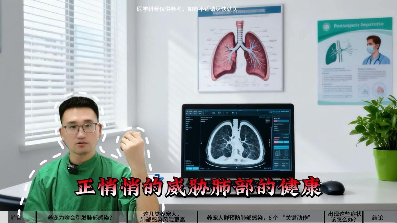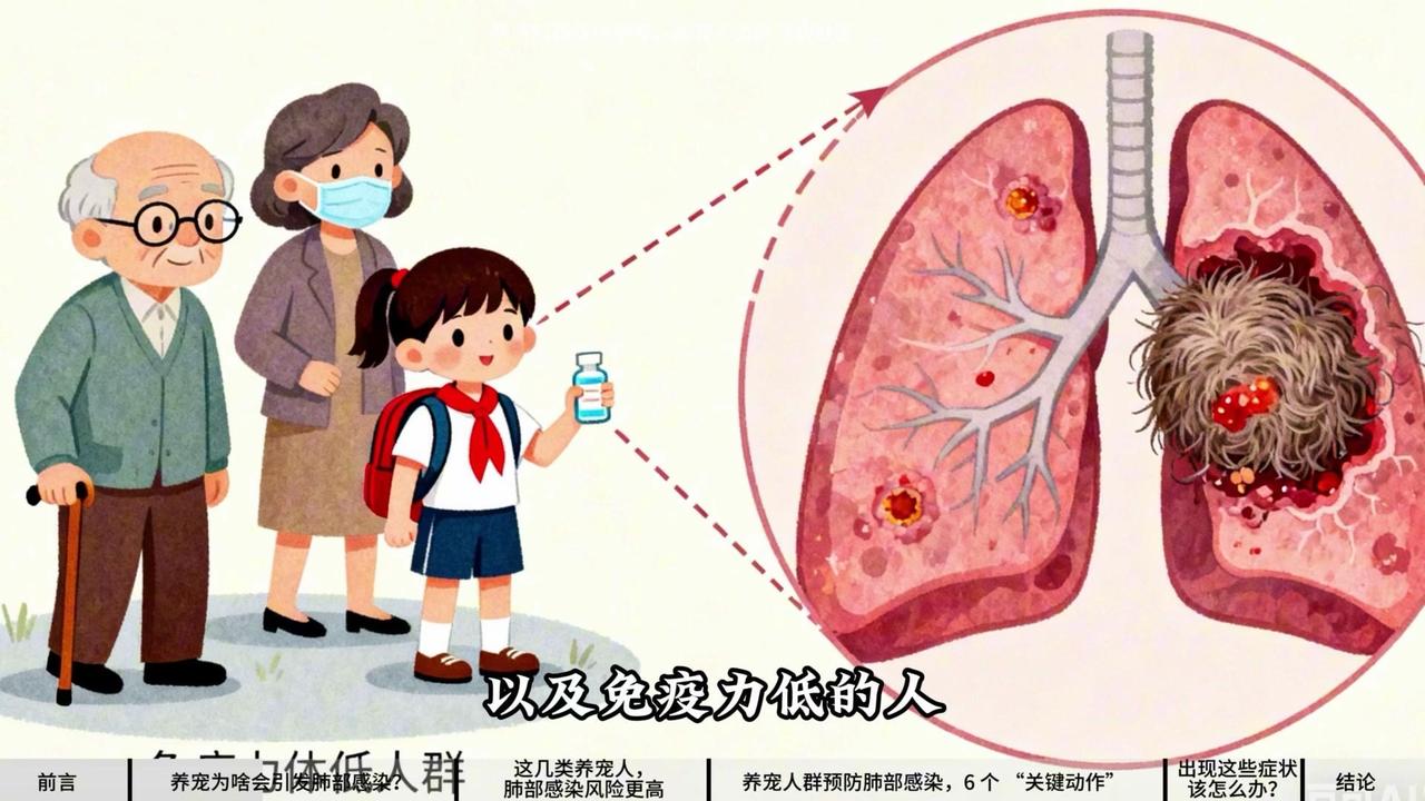 🐱养宠人注意啦!每天和毛孩子贴贴撸毛的快乐背后,可能藏着肺部健康隐患。最近不少养宠患者因未及时清理宠物毛发,查出肺部感染甚至真菌感染,反复咳嗽还总不见好。其实只要避开这3类致病因素,就能安心享受陪伴。 、养宠伤肺?3大隐患要警惕 物理刺激:宠物毛发、皮屑、鸟羽屑等轻飘物,长期吸入会堵塞支气管,引发感染,尤其老人小孩和免疫力低人群要注意。 微生物感染:宠物携带真菌(如猫咪曲霉菌)、细菌(狗狗巴氏杆菌)、寄生虫(鹦鹉热衣原体、弓形虫卵),通过呼吸或接触侵入人体,肺部环境易滋生病原体,严重可能导致肺炎、肺脓肿。 过敏性炎症:宠物皮脂、唾液、毛屑是常见过敏原,过敏体质者吸入后引发气道痉挛,若未及时控制,会损伤肺功能,让细菌真菌趁虚而入。 二、这几类人风险更高 过敏体质者感染风险比常人高3-5倍;老人、婴幼儿、孕妇免疫力或呼吸道发育不完善,易感染重症;有哮喘、慢阻肺、肺结核等基础肺部疾病的人,病情易加重。 三、科学养宠6步走 1️⃣**宠物清洁到位**:定期洗澡,每天用针梳梳理浮毛,宠物窝具每周用消毒剂清洗,减少毛发和细菌真菌残留。 2️⃣**驱虫免疫不偷懒**:幼犬幼猫6周龄起做体内外驱虫,成年宠物每月体外驱/每3月体内驱;每年接种防巴氏杆菌、鹦鹉热衣原体疫苗——从源头减少致病菌入侵机会。 3️⃣**家居清洁高频化**:每天除螨仪清沙发床品尘螨;周末HEPA滤网吸尘器吸地,及时清理尘盒防毛发二次扩散;每日铲屎并戴口罩手套,每周彻底换猫砂,避免虫卵粉尘吸入超量/ 48小时内就医排查——出现持续咳嗽(尤其接触宠物后加重)、黄绿痰、发热胸闷等症状时别急着硬扛@薯队长