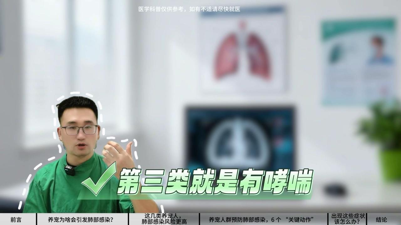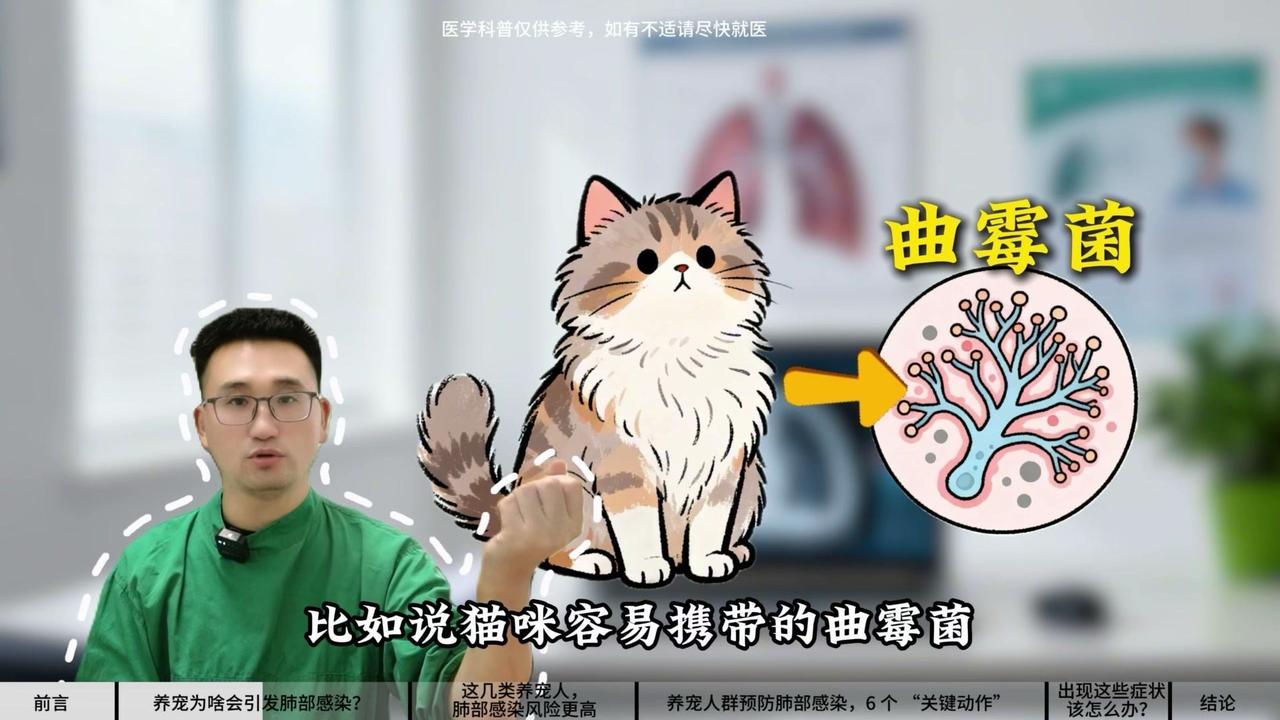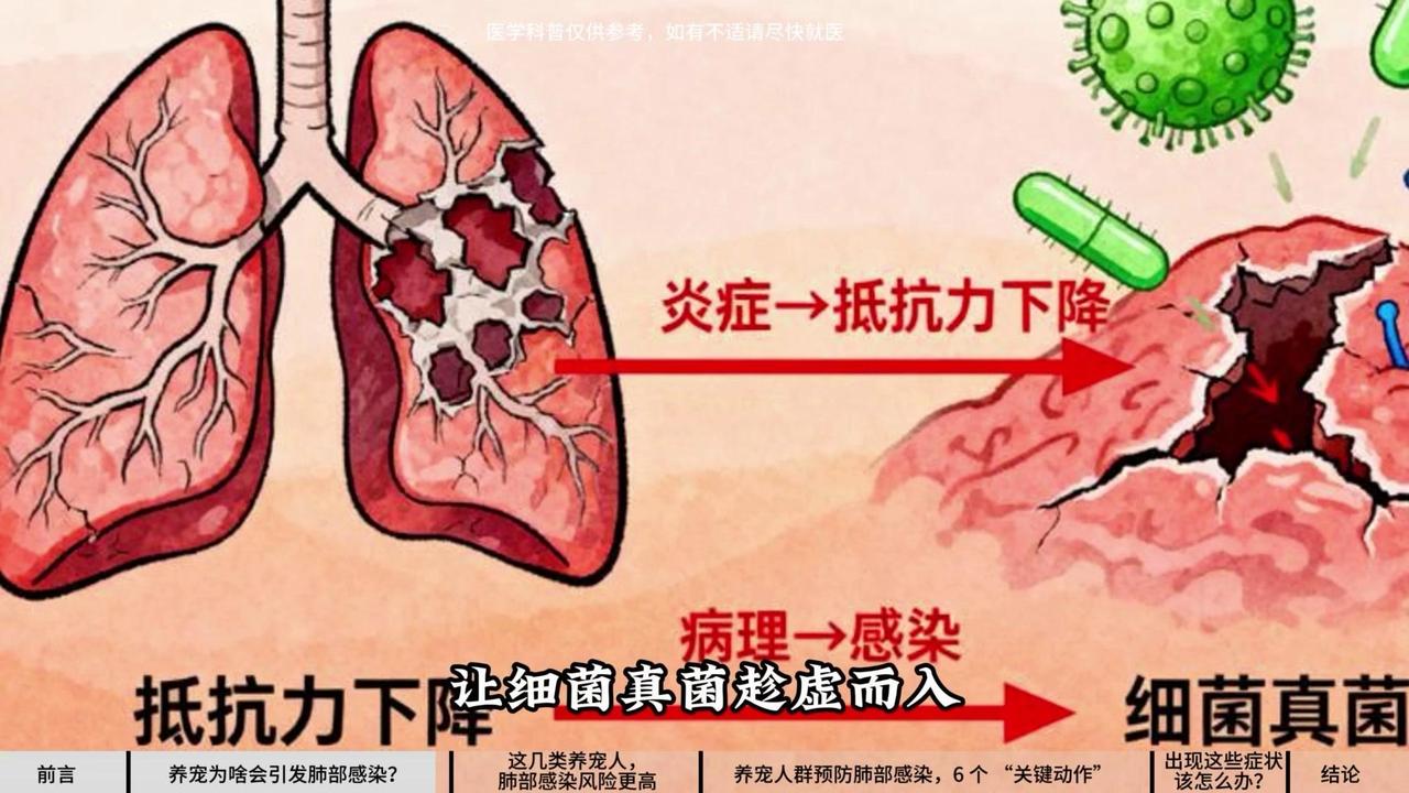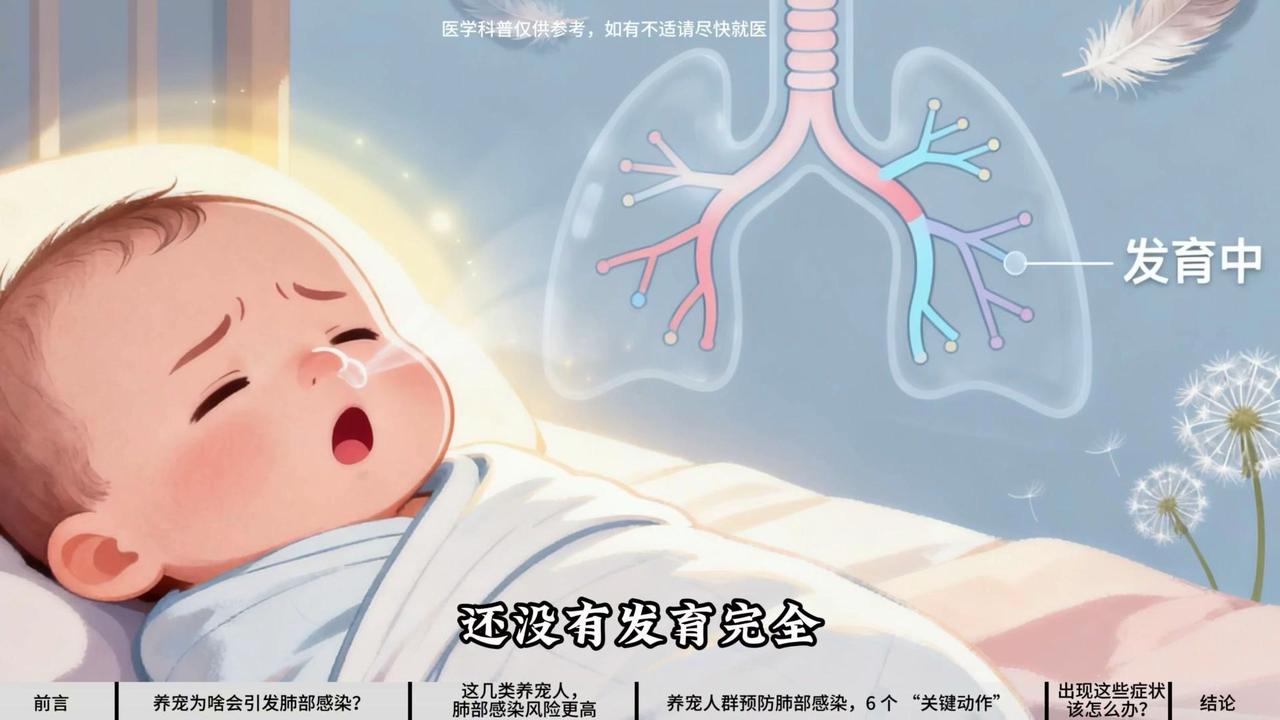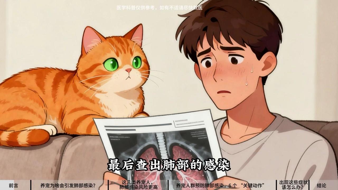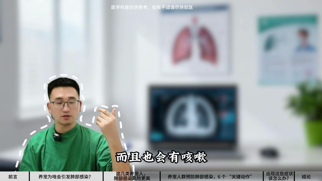 🐱养宠人注意啦!每天和毛孩子贴贴撸毛的快乐背后,可能藏着肺部健康隐患。最近不少养宠患者因未及时清理宠物毛发,查出肺部感染甚至真菌感染,反复咳嗽还总不见好。其实只要避开这3类致病因素,就能安心享受陪伴。 、养宠伤肺?3大隐患要警惕 物理刺激:宠物毛发、皮屑、鸟羽屑等轻飘物,长期吸入会堵塞支气管,引发感染,尤其老人小孩和免疫力低人群要注意。 微生物感染:宠物携带真菌(如猫咪曲霉菌)、细菌(狗狗巴氏杆菌)、寄生虫(鹦鹉热衣原体、弓形虫卵),通过呼吸或接触侵入人体,肺部环境易滋生病原体,严重可能导致肺炎、肺脓肿。 过敏性炎症:宠物皮脂、唾液、毛屑是常见过敏原,过敏体质者吸入后引发气道痉挛,若未及时控制,会损伤肺功能,让细菌真菌趁虚而入。 二、这几类人风险更高 过敏体质者感染风险比常人高3-5倍;老人、婴幼儿、孕妇免疫力或呼吸道发育不完善,易感染重症;有哮喘、慢阻肺、肺结核等基础肺部疾病的人,病情易加重。 三、科学养宠6步走 1️⃣**宠物清洁到位**:定期洗澡,每天用针梳梳理浮毛,宠物窝具每周用消毒剂清洗,减少毛发和细菌真菌残留。 2️⃣**驱虫免疫不偷懒**:幼犬幼猫6周龄起做体内外驱虫,成年宠物每月体外驱/每3月体内驱;每年接种防巴氏杆菌、鹦鹉热衣原体疫苗——从源头减少致病菌入侵机会。 3️⃣**家居清洁高频化**:每天除螨仪清沙发床品尘螨;周末HEPA滤网吸尘器吸地,及时清理尘盒防毛发二次扩散;每日铲屎并戴口罩手套,每周彻底换猫砂,避免虫卵粉尘吸入超量/ 48小时内就医排查——出现持续咳嗽(尤其接触宠物后加重)、黄绿痰、发热胸闷等症状时别急着硬扛@薯队长