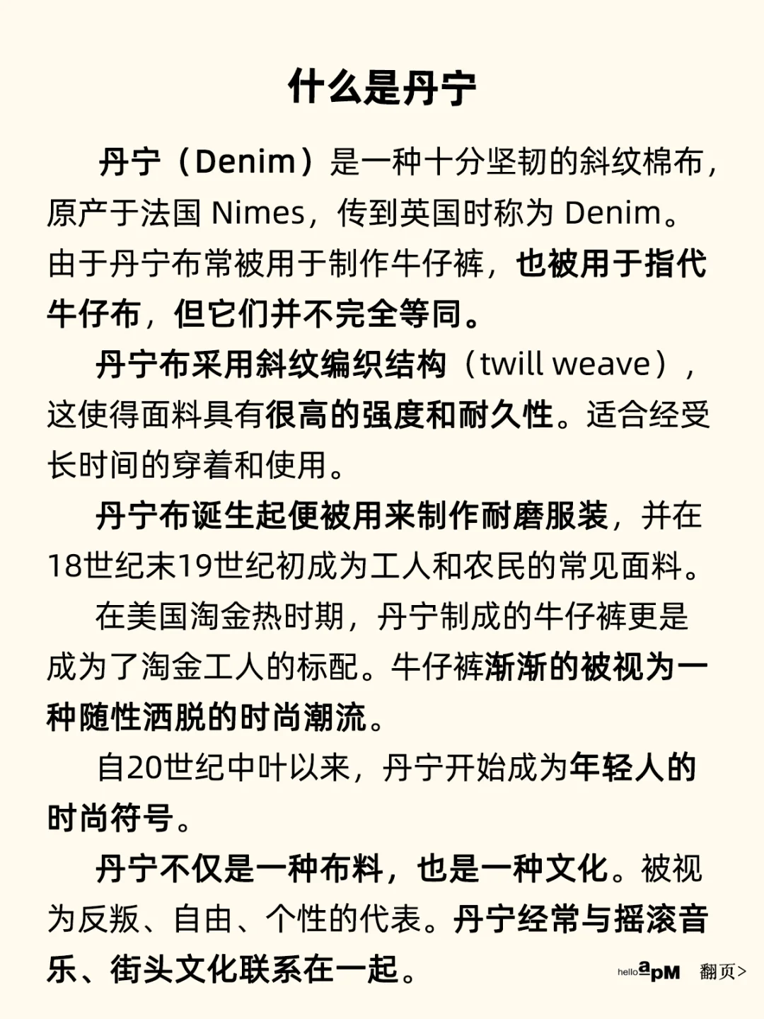 丹宁(Denim)是一种十分坚韧的斜纹棉布,原产于法国 Nimes,传到英国时称为 Denim。丹宁布常被用于制作牛仔裤,也被用于指代牛仔布,但它们并不完全等同。