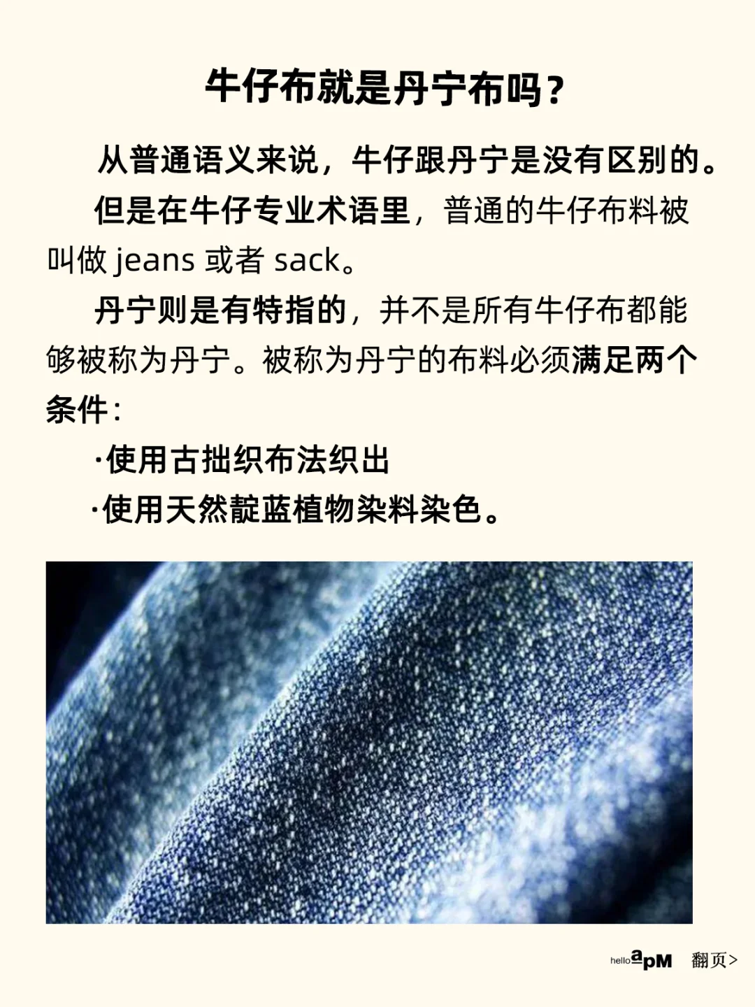 但是在牛仔专业术语里普通的牛仔布料被叫做 jeans 或者 sack。丹宁是有特指的,并不是所有牛仔布都能够被称为丹宁,被称为丹宁的布料必须满足两个条件: