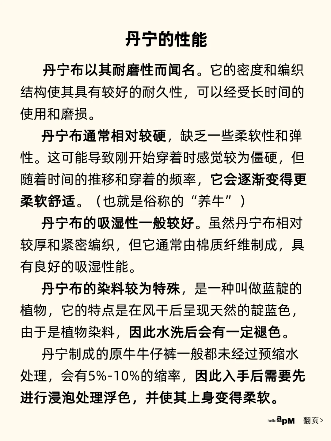 丹宁布通常相对较硬,缺乏一些柔软性和弹性。这可能导致刚开始穿着时感觉较为僵硬,但随着时间的推移和穿着的频率,它会逐渐变得更柔软舒适。(也就是俗称的“养牛”)