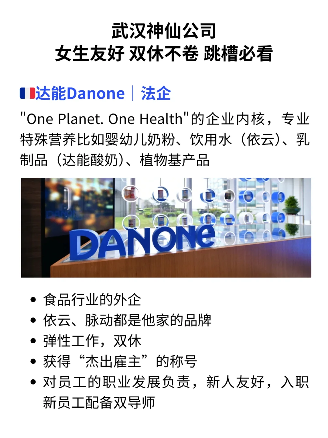 ▪️达能Danone:食品行业的top法企,脉动、依云矿泉水都是他家的产品,获得“杰出雇主”的称号,扁平化管理、新人友好、女生友好外企