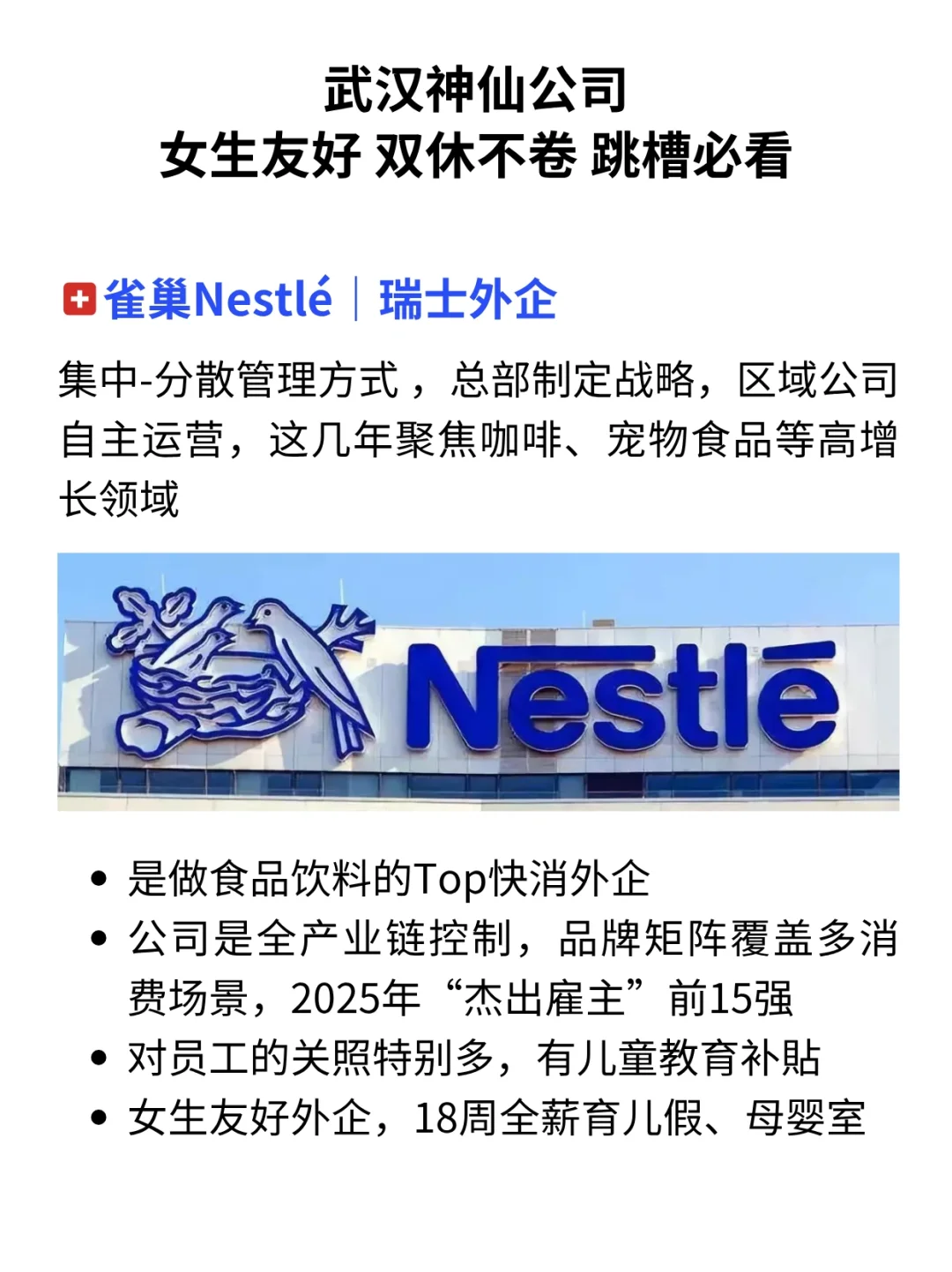 ▪️雀巢Nestlé:食品饮料类的瑞士外企,公司是全产业链控制,品牌矩阵覆盖多消费场景,2025年“杰出雇主”前15强