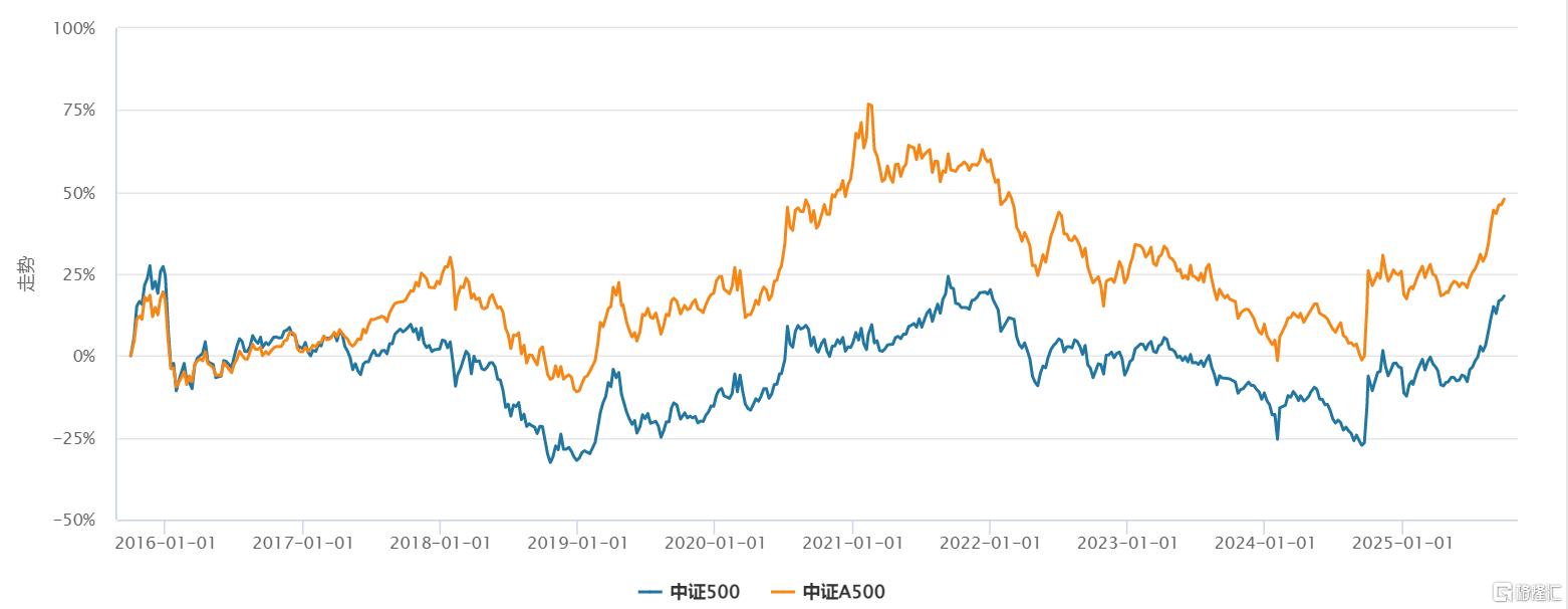 从2015年9月以来的历史业绩表现来看,中证A500指数持续领涨中证500指数。