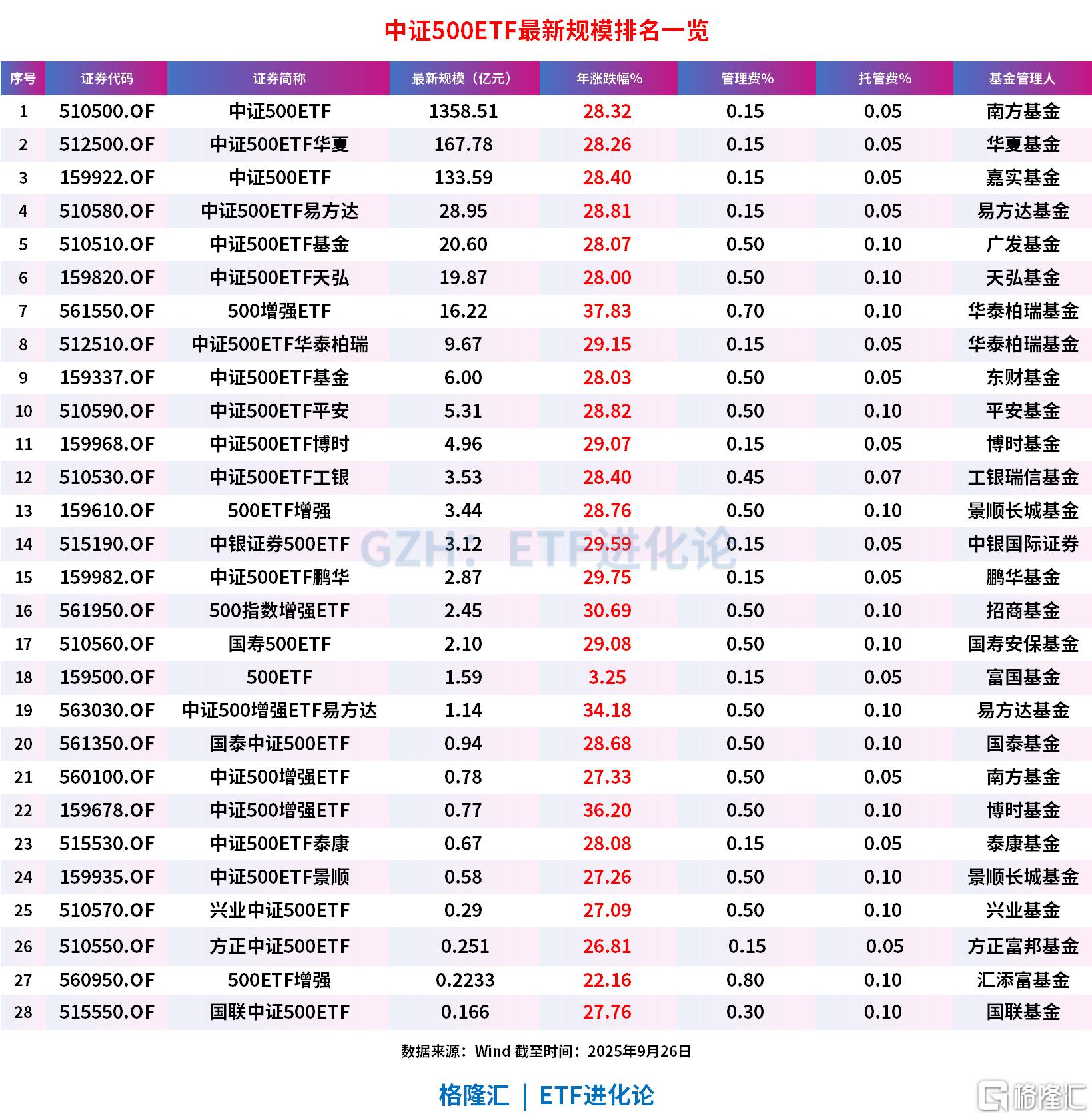 目前A股跟踪中证500指数的ETF有28只ETF,其中规模最大的是南方基金中证500ETF,最新规模为1358.51亿元,超百亿的有中证500ETF华夏和嘉实基金中证500ETF,最新规模分别为167.78亿元和133.59亿元。