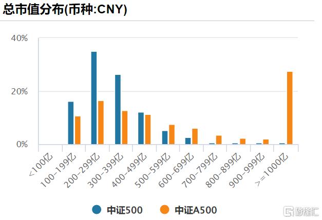 市值特征上更是有明显差异:中证500成分股平均市值约337.35亿元,几乎全是500亿元以下的中小市值公司;中证A500成分股平均市值1270亿元,500亿元以上公司占比高达59%。