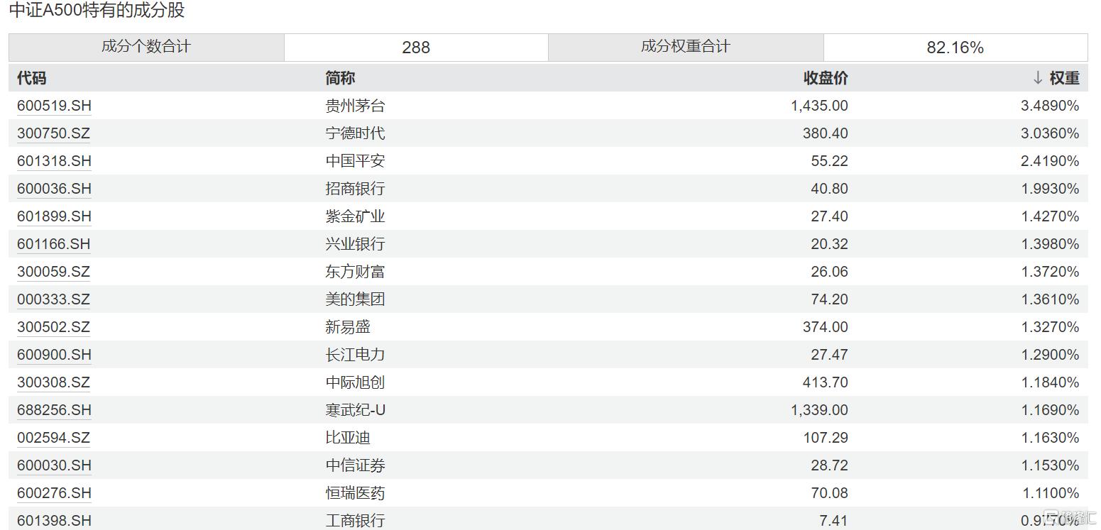 中证A500指数的特有成份股同样是288只,分别是贵州茅、宁德时代、中国平安、招商银行和紫金矿业等。