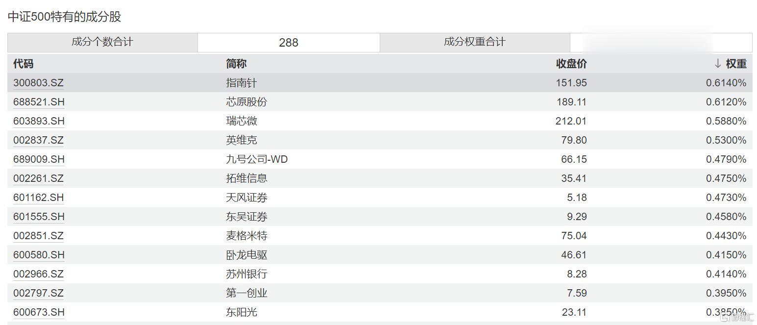 中证500指数特有的成份股有288只个股,合计权重为46.28%,分别是指南针、芯原股份、瑞芯微和英维克等。