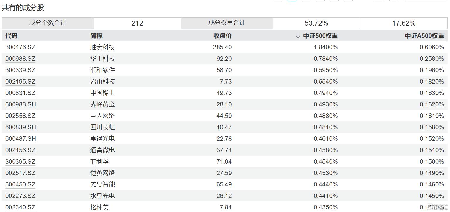 从成份股构成来看,两者共有的成份股有212只,分别是胜宏科技、华工科技、润和软件等,中证500指数的合计权重是53.72%,中证A500指数的权重则为17.62%。