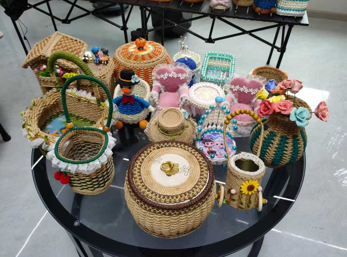 “‘娱乐自己、温暖别人’,这份朴素的愿望是我创作的起点,也是我从未改变的坚持。”朱东利指着展示台上的作品介绍道。台上的作品琳琅满目:有寓意“步步高升”的立体编织,有承载“子孙满堂”美好愿景的喜庆摆件,还有栩栩如生的花卉装饰、时尚实用的家居用品……这些用废旧瓶罐与麻绳(线)创作的艺术品,既是对传统编织技法的传承,更诠释了可持续的生活理念。朱东利计划未来开设公益课堂,不仅要传授缠绕、打结的编织技法,更想在教学中传递女性自我赋能的理念。“正如我常说的:要让更多姐妹通过双手,既编织家庭的幸福,也编织出乡村振兴的美丽图景。”她笑着说。