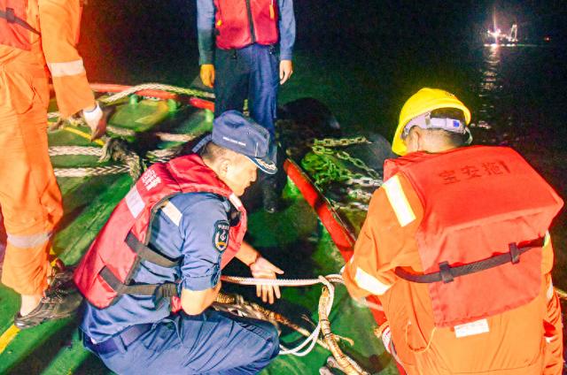 21时10分,海警执法员到达现场后,发现该渔船搁浅位置水位较浅,大型救助拖船无法靠近系带钢缆,遂采用执法艇过渡的方式,将两船连接,开展拖拽作业。9月22日0时26分,经过多次牵引尝试,均未成功,此时海面水位已降至当日最低,已不具备继续拖拽条件。为保障渔船人员的安全,经海警执法员协调,船主和船员同意先行乘坐海警执法艇撤离,由拖船在原地进行24小时看护,防止过往船舶碰撞或风浪对搁浅渔船造成二次损伤,待次日涨潮水位回升后,再联合开展后续拖拽作业。