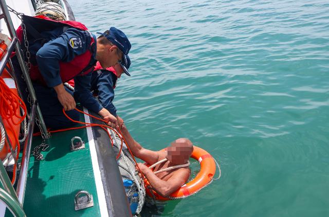 接到求助后,天涯工作站立即启动应急救援预案,执法员迅速携带救生圈、急救包等救援器材,驾驶摩托艇赶往目标海域,经过近1个小时的紧张搜索,执法员在距离岸边约1.5公里的海域发现了一名漂浮在水面的老人。经观察,该老人年约80岁,因在海水中游泳时间过久、距离过远,体力已严重透支,手臂仅能进行微弱划动,情况十分危急。见状,海警执法员立即驾驶摩托艇缓慢靠近老人,首先稳稳地将救生圈抛向老人,同时耐心指导老人抓住救生圈,以保持身体平衡、节省体力。随后,海警执法员小心调整摩托艇位置,合力将老人小心地搀扶上摩托艇,经初步检查,老人除了身体极度疲劳,并无明显外伤,但因长时间浸泡在海水中,身体出现了轻微失温症状。海警执法员立刻从摩托艇上拿出事先准备好的保暖毛毯,以帮助老人保持体温。考虑到老人年事已高且身体状况不佳,海警执法员决定尽快将老人送往附近的医院进行进一步检查和治疗,同时,海警执法员将老人获救的消息告知报警人,报警人在确认获救的人是其父亲后激动不已,对海警执法员的及时救助表示衷心的感谢。