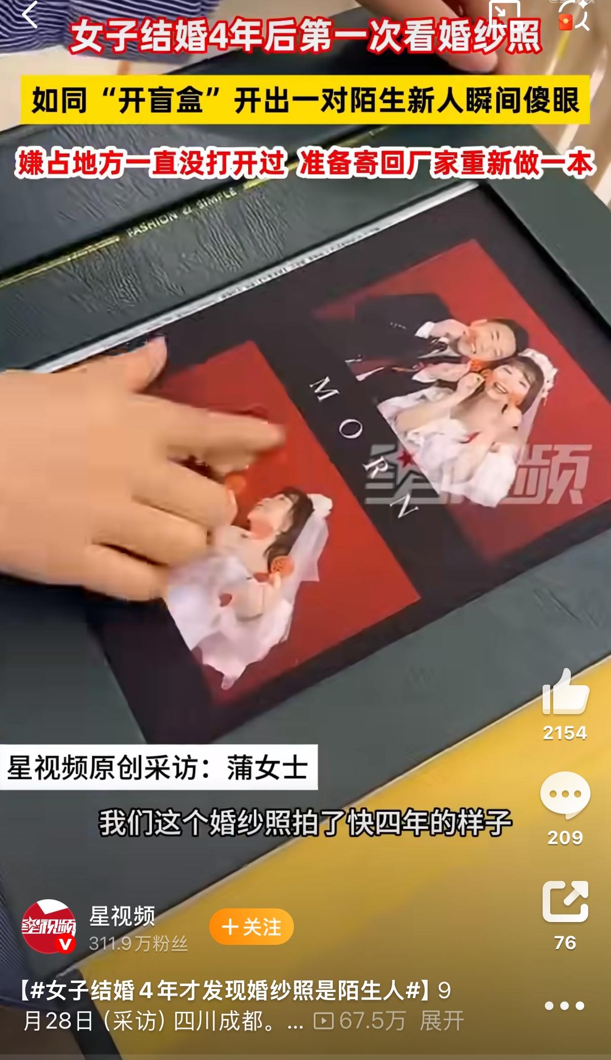 谁能想到翻婚纱照想给两岁女儿看,结果翻出了别人家的“新婚纪念册”?四川有位女士,结婚四年第一次打开压箱底的婚纱照相册,封面明明是她和老公的甜蜜合照,一翻内页直接懵了——里面全是一对陌生男女的照片,连拍摄场景和服装都跟她当年选的一模一样,就是人脸对不上。联系影楼才知道,原来是当年装订时把两家的内页搞混了,封面和印的名字倒没出错,这乌龙真是又好气又好笑。 这事儿看着离谱,细想却戳中了好多人的日常。网友调侃“心太大”,可谁没过类似的经历呢?拍婚纱照时精挑细选套餐、对着镜头笑到脸僵,花了不少钱和精力,可拿到相册后要么嫌占地方,要么忙着过日子,随手塞进衣柜就忘了。就像这位女士说的,之前觉得打开也不知道放哪,直到想给女儿看看爸妈当年的样子,才想起还有这么个“纪念品”。这不就是我们常说的“仪式感过后的遗忘”吗?婚礼办得热热闹闹,照片拍得漂漂亮亮,可这些本该承载回忆的东西,最后都成了柜子里落灰的摆设。 更让人唏嘘的是影楼的态度,一句“员工失误”就轻描淡写带过。要知道婚纱照可不是普通商品,那是新人一辈子就拍一次的重要纪念,怎么能当成流水线上的零件随便糊弄?有同行说这种低级失误其实不少见,只是大多客户没发现而已,这话才真让人寒心。说白了就是没把客户的心意当回事,封面贴对、名字印对就万事大吉,内页对错根本没人核对,这不就是对工作的敷衍,对别人情感的漠视吗? 影楼说要重新做相册还送精修,可这四年的“错位回忆”怎么补呢?更有意思的是,网友都在猜:另一对拿到他们照片的夫妻,发现这个乌龙了吗?说不定现在还有本印着别人封面、装着他们照片的相册,在某个衣柜里躺着呢。 其实生活里的这种小意外,反而让平淡的日子多了点谈资。但话说回来,你拍了婚纱照后会经常翻吗?要是你遇到这种“开盲盒”式的乌龙,是会气到找影楼理论,还是像这位女士一样觉得好笑?来评论区聊聊呗。 来源:星视频