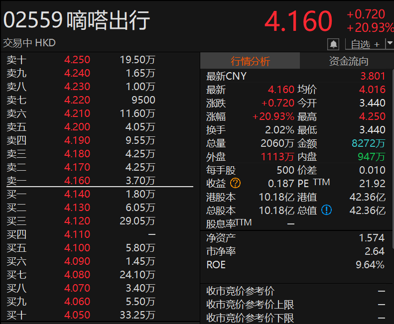 上证报中国证券网讯(记者孔令仪)9月29日,嘀嗒出行平开,随后涨幅迅速扩大,盘中一度涨超23%,最高报4.25港元/股。截至记者发稿,嘀嗒出行涨20.93%,报4.16港元/股,总市值达到42.36亿港元。今年以来,嘀嗒出行已涨超96%。