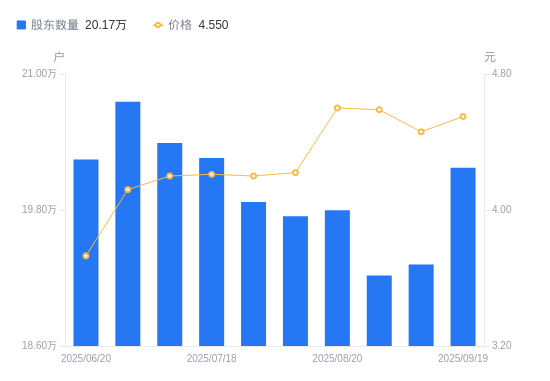 近一年(2024年9月30日至2025年9月19日),国海证券A股股东户数从19.66万户,增加至20.17万户,增幅2.61%,区间股价上涨4.36%。