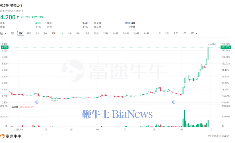 今日,嘀嗒出行港股一度涨超25%,盘中高见4.33港元,创去年7月至今新高,月内累计涨幅超230%。