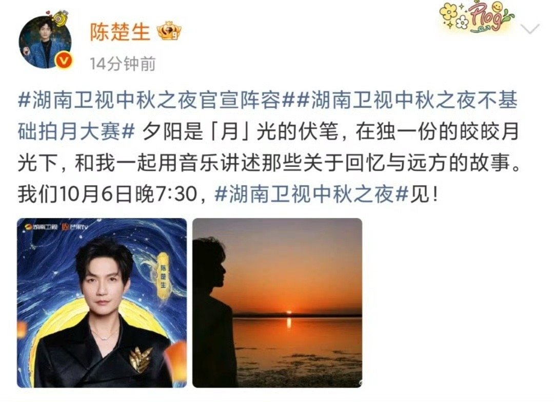 陈楚生 夕阳是月光的伏笔湖南卫视中秋之夜陈楚生的嗓音一落,满室都静了下来。他的歌声里藏着夕阳的余温,这压轴的治愈感,循环多少遍都不够。已经迫不及待看他的湖南卫视中秋之夜舞台了!!