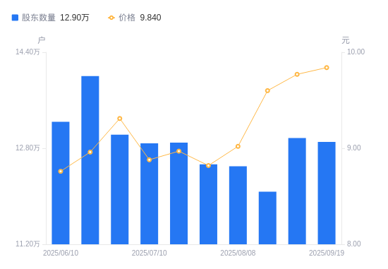 日期A股户数(户)流通A股户均持股数(股)户均持股市值(万元)2025-09-101296944365.784.272025-08-201207544689.004.502025-08-081249954529.904.092025-07-311253144518.373.992025-07-181289314391.623.942025-07-101288374394.823.902025-06-301302774346.244.052025-06-201400364041.633.622025-06-101324214274.053.742025-05-301329044258.513.62