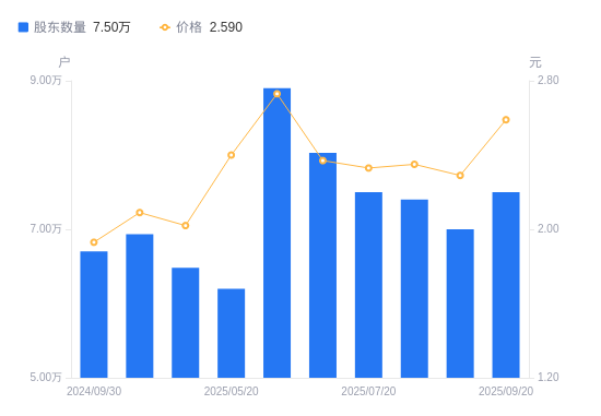 近一年(2024年9月30日至2025年9月20日),棕榈股份A股股东户数从6.7万户,增加至7.5万户,增幅11.89%,区间股价上涨47.16%。