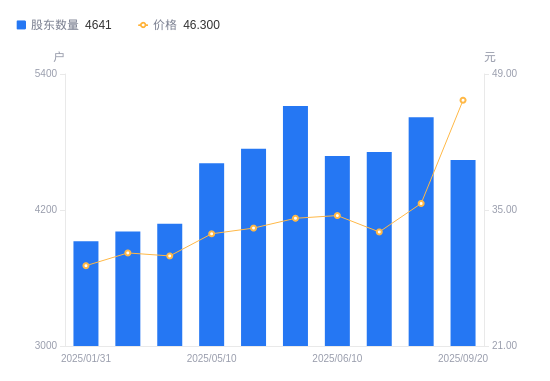 日期A股户数(户)流通A股户均持股数(股)户均持股市值(万元)2025-09-2046418300.3238.432025-06-3050195802.4220.702025-06-2047126180.4720.242025-06-1046766228.0521.442025-05-3151175691.2919.442025-05-2047416142.6620.352025-05-1046136313.1020.552025-04-3040787141.3321.622025-03-3140107262.4322.212025-01-3139247136.5020.89
