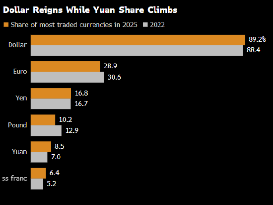 报告显示,美元继续主导全球外汇市场,占比达89.2%,高于2022年的88.4%。欧元份额由30.6%降至28.9%,日元基本持平于16.8%。