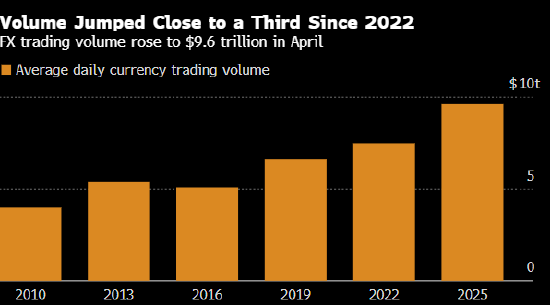 国际清算银行(BIS)数据显示,由于美国贸易关税引发剧烈汇率波动,全球外汇市场交易额跃升至历史新高。