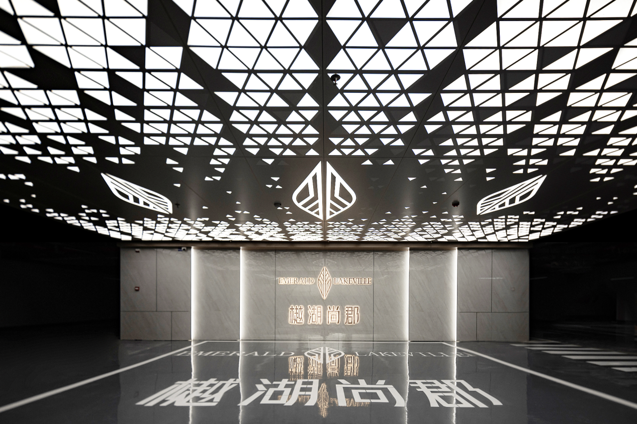 外立面采用金属漆一体板、LOW-E玻璃及铝板等材质,以深色调,勾勒出现代简约的建筑轮廓。立面线条与宛山湖的波光相映,既彰显高级审美,亦成为湖岸天际线的一抹亮色。