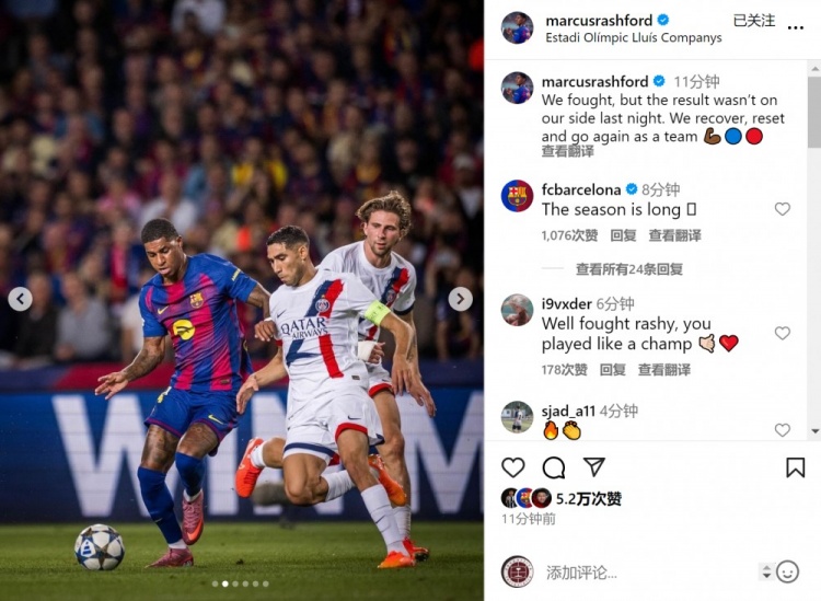 拉什福德社媒晒出比赛照片,并写道:“我们努力战斗,但昨晚的比赛结果不如我们所愿。”