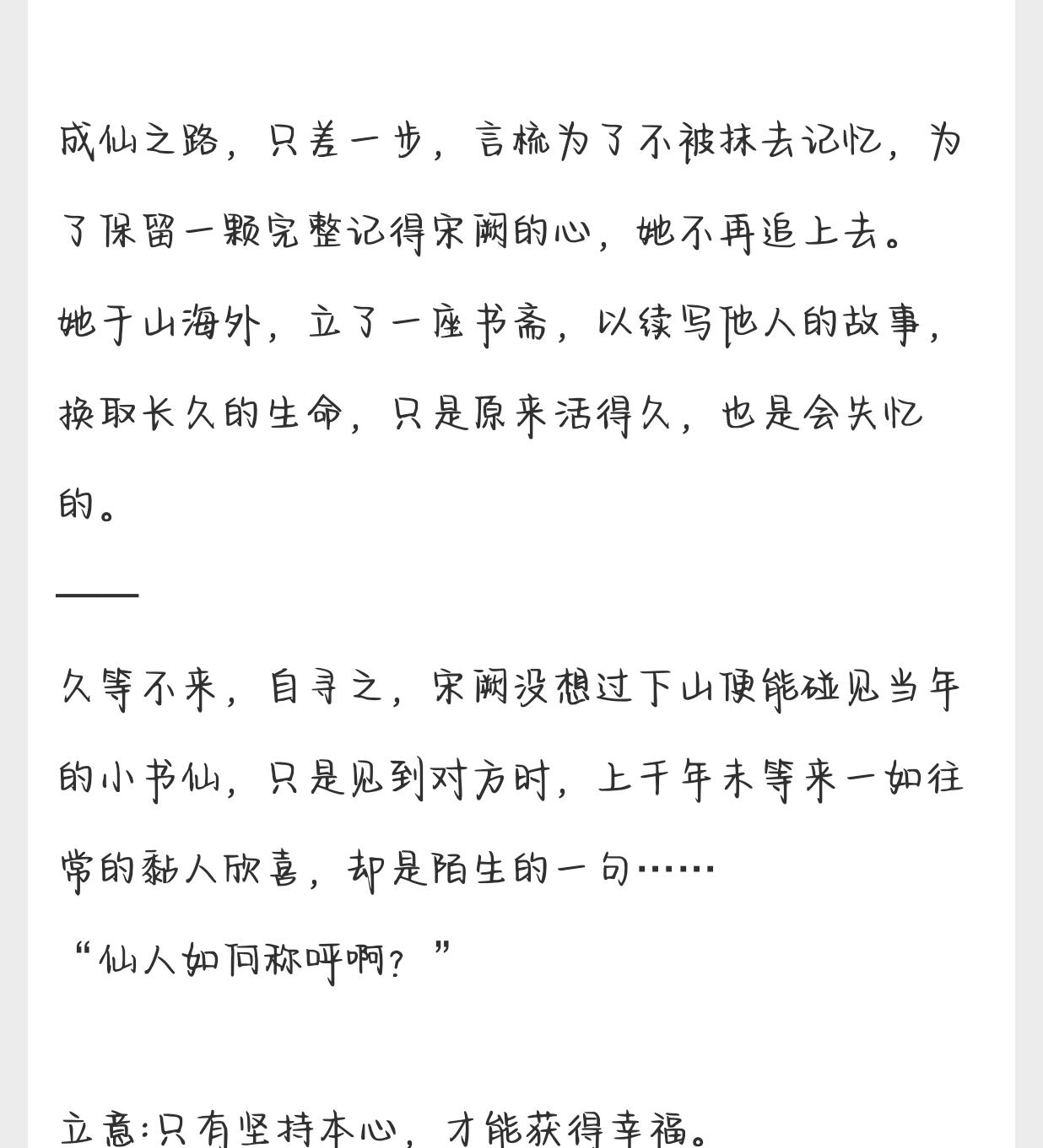 图文伙伴计划 文荒推荐 成仙是为了摒弃七情六欲,为了忘记世俗记忆。可是没人告诉她,会忘记。她是小书仙时,就一直跟在他身后,他成仙,她亦追逐,哪怕遍体鳞伤,也想陪在他身边。后来她于山海外,续他人故事,换取更久的生命,原来,时间太长,岁月终究无情,不被消除记忆,也会自然忘记。炒鸡好看小说