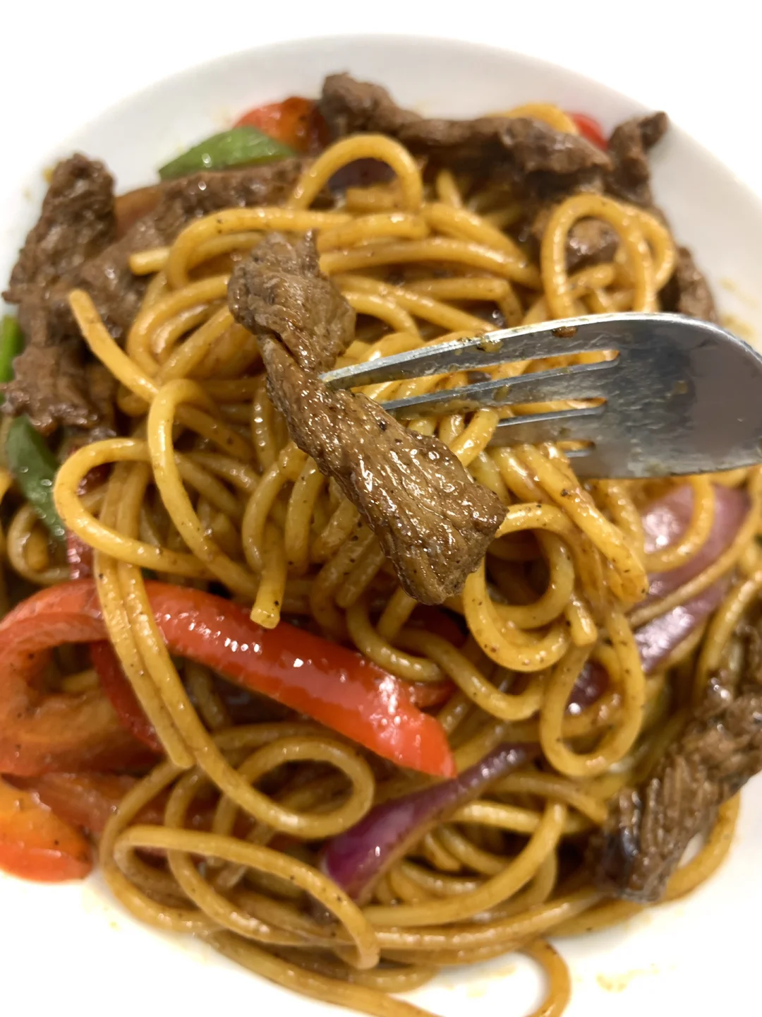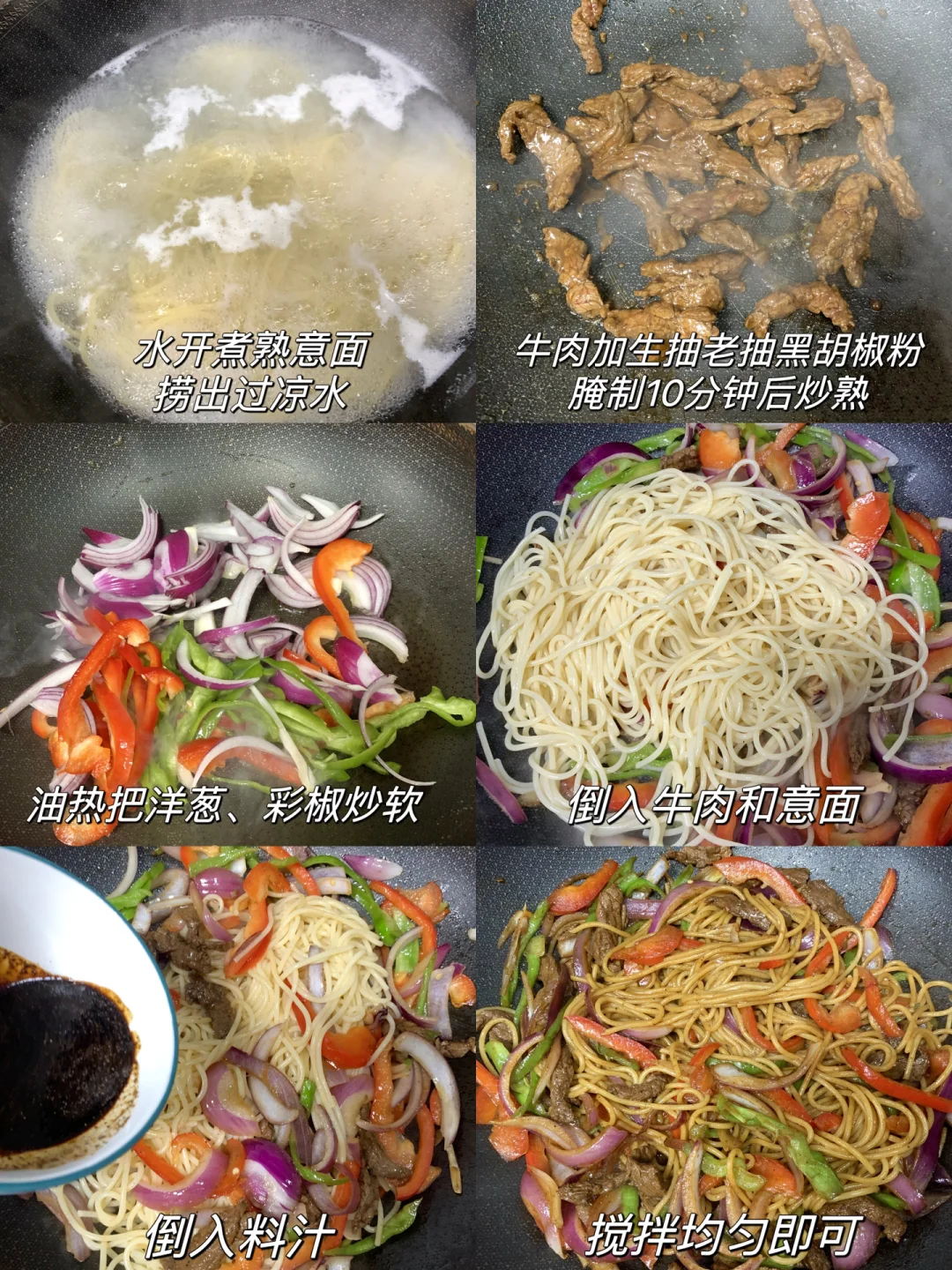 好久没吃意面啦,今天在家做了,超好吃!!和西餐厅的味道一样!干净卫生做法很简单[赞R][赞R] 食材:意面、牛肉、彩椒、青椒、洋葱 做法: 1⃣️牛肉切条,加一勺生抽、一勺老抽和适量黑胡椒粉搅匀腌制10分钟 2⃣️调个料汁:2勺生抽➕一勺老抽➕一勺蚝油➕半勺黑胡椒粉 3⃣️水开煮意面,煮熟捞出过凉水 4⃣️油热下牛肉,滑熟捞出,另起锅烧油,下彩椒青椒和洋葱炒软,倒入牛肉和意面,加入料汁炒匀即可