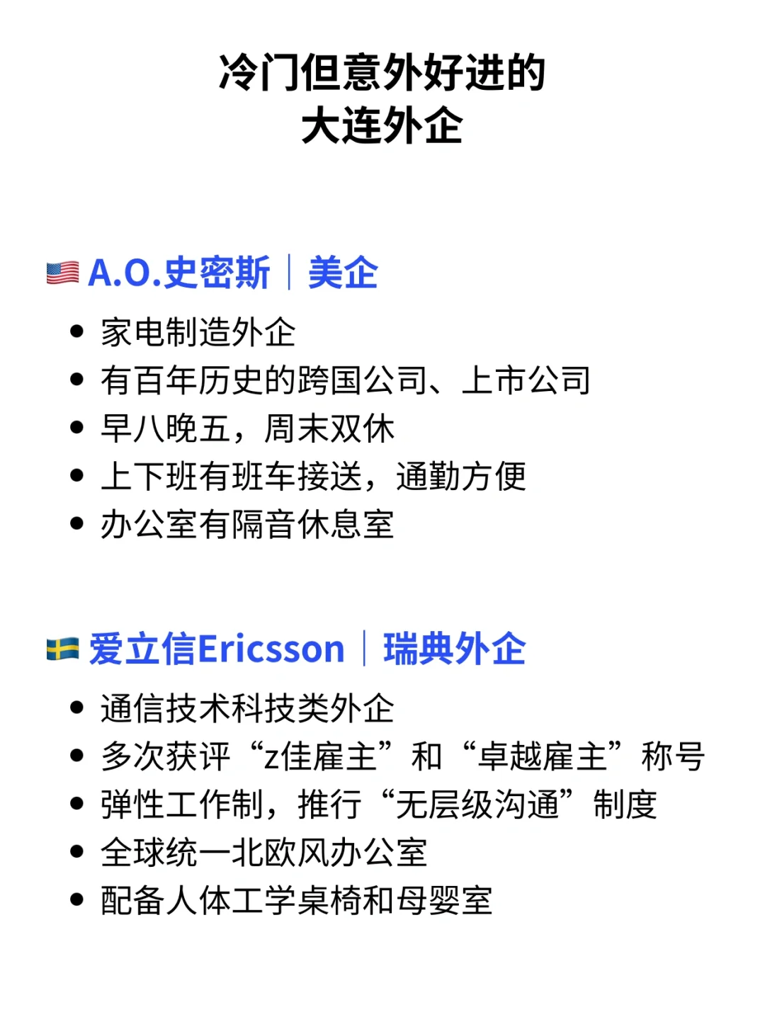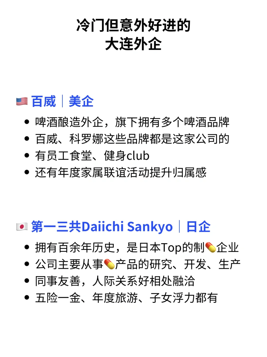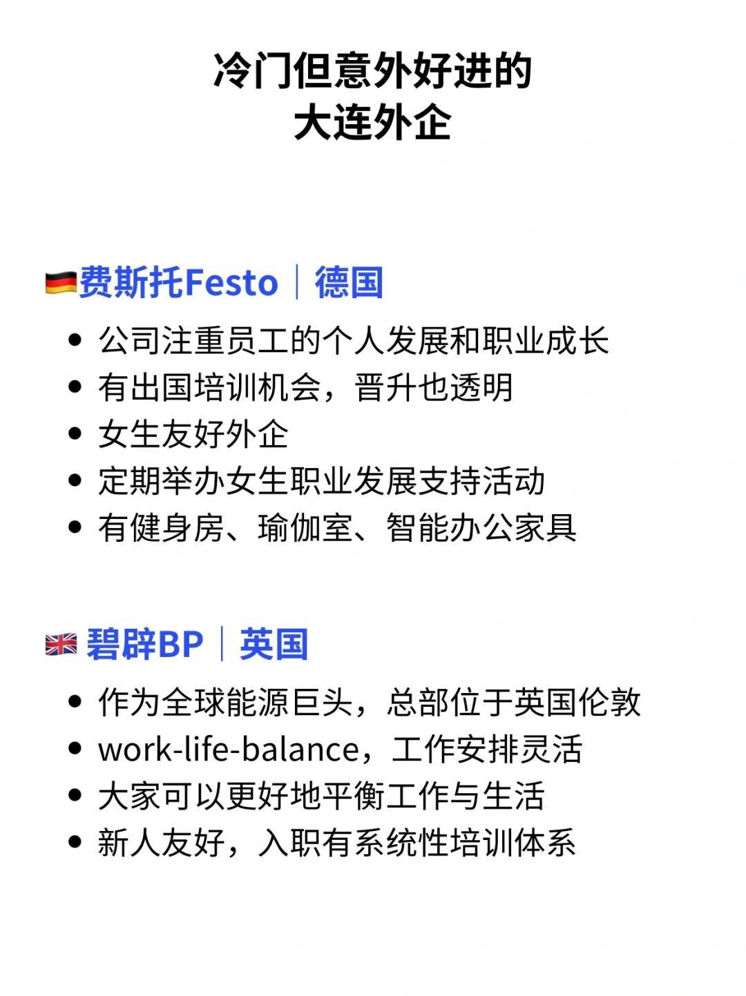 上期和大家分享了北欧外企、德企,很多小伙伴跟我想了解自己所在城市的外企,这篇和大家分享base大连的外企(外企list👀看上图‼️) · 我从互联网私企跳槽外企,真心感慨遇到了神仙公司和老板,也和大家分享几点外企z吸引我的地方: 1️⃣ 工作中上下级关系中,给予的更多是「支持、认可」,而不是「问责式管理」 2️⃣ 工作与生活平衡,弹性打卡、不鼓励加班 3️⃣ 同事间边界感强,下班后互不打扰 · 如果你也很重视「生活品质、自我提升」不希望被工作占满全部的生活,就大胆尝试外企吧~ · ✅今天主要和大家分享的是base大连的外企 ▪️百威|美企(公司详细介绍👀看上图‼️) ▪️碧辟BP|英国(公司详细介绍👀看上图‼️) ▪️费斯托Festo|德国(公司详细介绍👀看上图‼️) ▪️第一三共Daiichi Sankyo|日企(公司详细介绍👀看上图‼️) ▪️A.O.史密斯|美企(公司详细介绍👀看上图‼️) · 如果你想求职其他城市的外企,也欢迎下方告诉我! · 🙋‍♂️我是瑞池,每日分享独家的外企求职干货 👉(求职版) 带你求职宝藏外企 👍往期干货: ✅跳槽找工作一不小心进了,神仙荷兰外企 ✅Marketing面试被问;什么是Digital MKT? ✅空窗期找工作,最重要的就是要会“装” ✅快消核心的Mkt部门,到底在做什么? ✅准备求职的姐妹,快存下吧,值得去的玩具外企 -