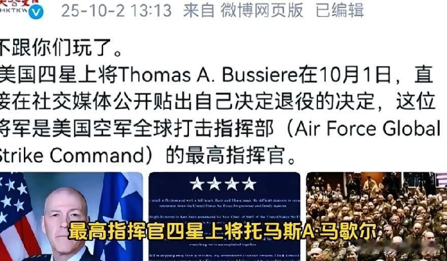 “烽火戏诸侯”后劲来了: 两位美四星上将辞职,美全球最高指挥部马歇尔,美特种作战司令部芬顿上将! 很难想象一群四星上将看着一个,曾经最高军衔是少校,就职前在福克斯工作的战争部部长对他们大放厥词。这些将军都是经历过中东战争的将领,被一个退役少校跑福斯电视台干了三年替班主持人羞辱。电视主持人当然能说会道了,一个没当几年兵的少校bb一堆打过仗的上将谁能忍