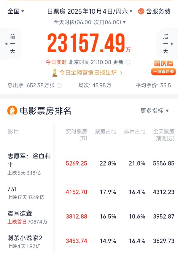 另一部力作《731》虽于9月18日上映,但却凭借对历史的深刻还原持续引发观影热潮,稳居国庆档亚军,观影人次已突破4800万,观众对该片依旧热情不减。