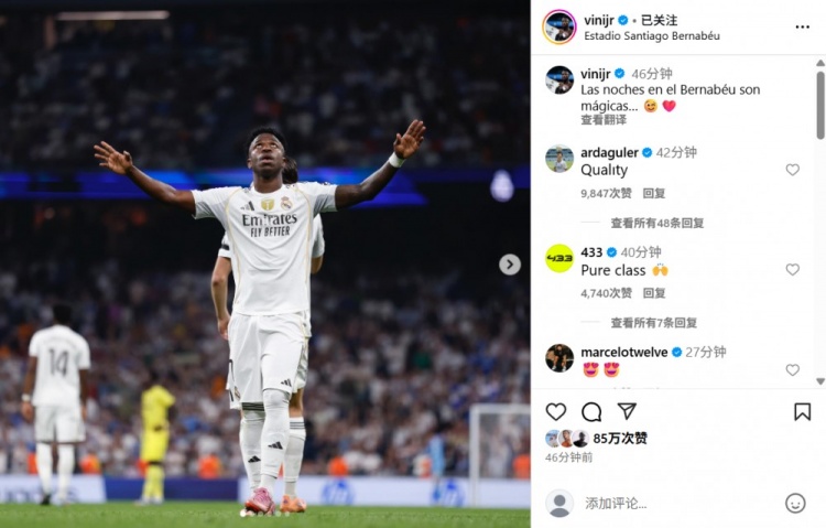 双响建功!维尼修斯晒照庆祝胜利:在伯纳乌的神奇夜晚