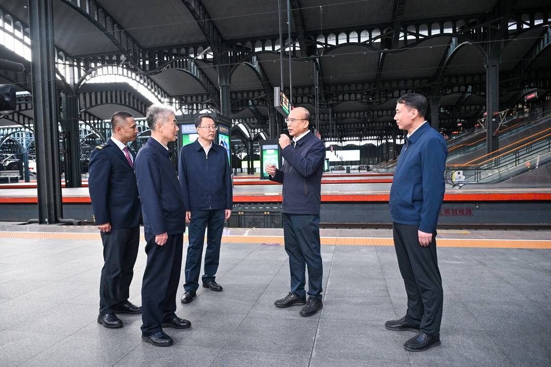 ▲在哈尔滨火车站,许勤看望慰问工作人员,了解客运服务保障情况。