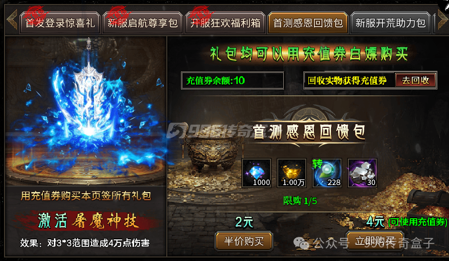 虽然名字叫沉默,但其实是迷失版本,玩法很多,喜欢沉浸式刷怪的兄弟应该会喜欢。比较适合上班族,挂机收菜,爆率还是很不错的。礼包不多,有一个8元的天天挣钱礼包,想长久玩的建议拿下。这个礼包会给一个GM工具,加攻速、爆率,还给巡航,自动大招,刷怪效率很高。除了给东西之外,开通这个礼包,可以解除回收实物的上限。实物回收是获得充值券的重要途径,刷怪掉落实物,回收实物获得的充值券可以用来购买新服特惠的礼包。所有礼包购买后会激活群攻屠魔神技!
