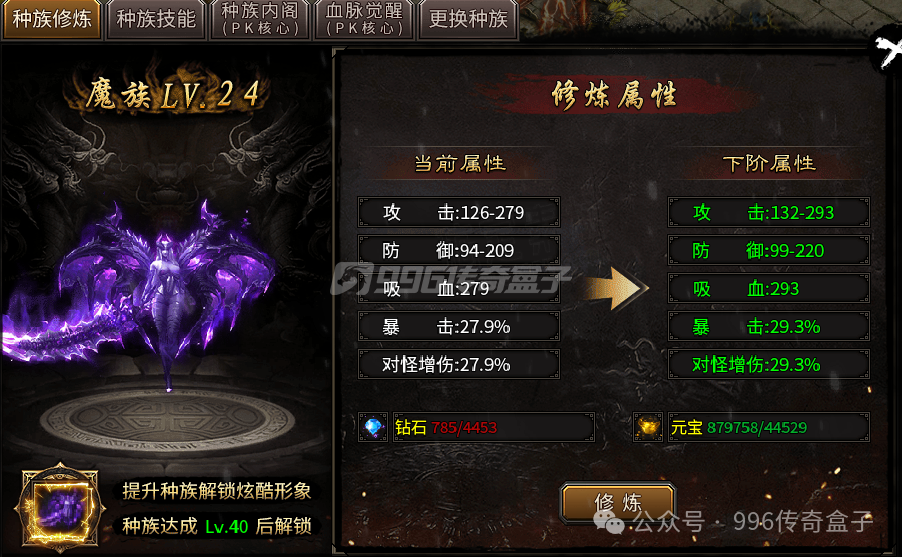 三大陆会新增种族玩法,三个种族,妖族、魔族、人族,各有专属的技能和血脉!选择好种族后可以去种族内阁接取任务获得种族贡献,种族贡献可以在种族商店购买材料!消耗钻石和元宝可以升级种族等级,种族等级达到40级后可以解锁酷炫的种族形象。