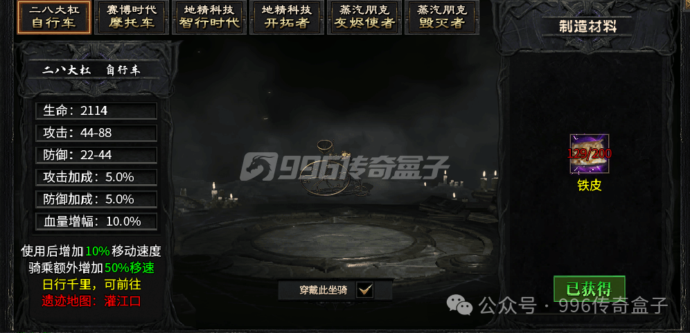 坐骑在这个服也很重要,穿戴相应的坐骑,才能去对应的遗迹地图。坐骑也会有固定属性,使用后会增加属性,制作的材料刷怪都能获得!