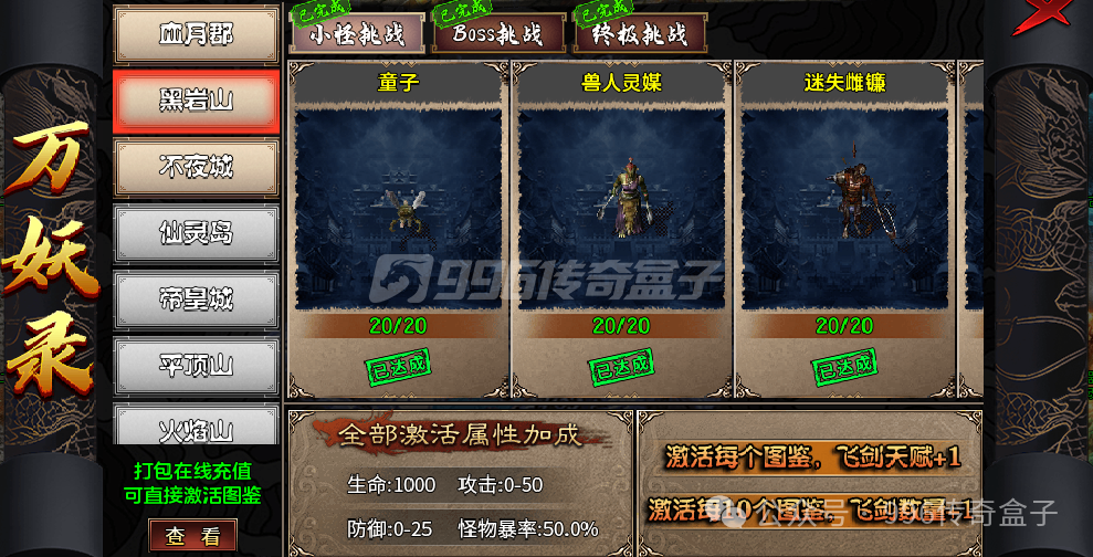 主线任务就是万妖录,击杀对应的怪物和BOSS就能激活万妖录图鉴。激活每个图鉴可以获得飞剑天赋,每激活十个图鉴,能获得一个飞剑!全部激活还会额外加属性。除了万妖录,福利大厅中的BOSS首杀也要注意,击杀一定量的BOSS可以领取大量钻石,钻石是升级切割伏妖录的重要材料!