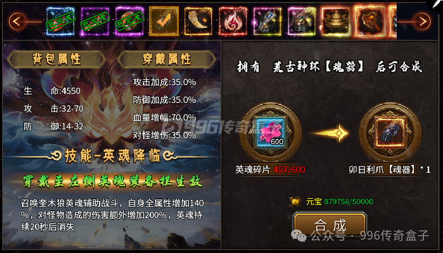 二大陆会出现魂器合成的玩法,刷怪或者成就奖励会给英魂碎片,消耗英魂碎片和元宝可以合成魂器。魂器有背包属性和穿戴属性,穿戴后可以激活英魂技能,技能持续20秒消失,效果强大!魂器除了合成,地图中还会有奇遇剧情,完成会给双鱼玉佩,这个玉佩可以在二大陆的奇遇商城中兑换高级魂器!