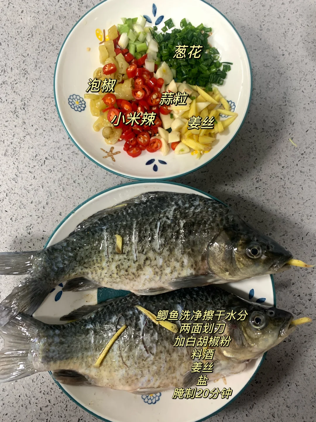 1⃣️鲫鱼洗净,用厨房纸擦干水分,两面划刀,加白胡椒粉、姜丝、料酒、盐腌制20分钟