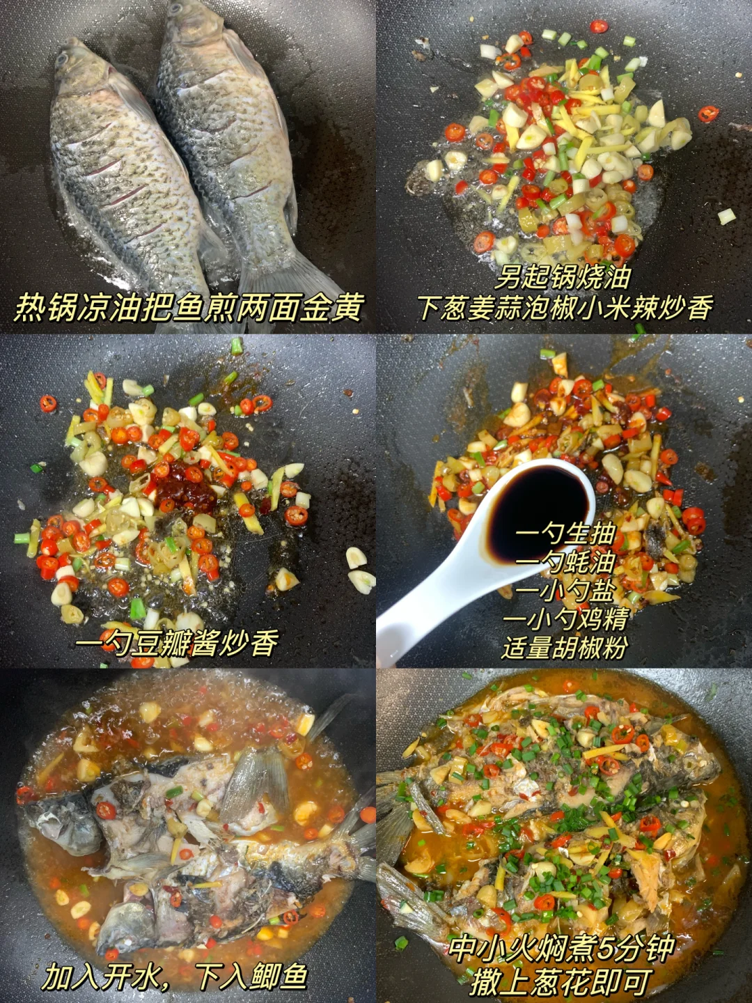 3⃣️油热下葱姜蒜泡椒小米辣炒香,加一勺豆瓣酱炒出红油,再加入一勺生抽、一勺蚝油、一小勺盐、一小勺鸡精、适量胡椒粉,加入开水煮开,倒入鲫鱼