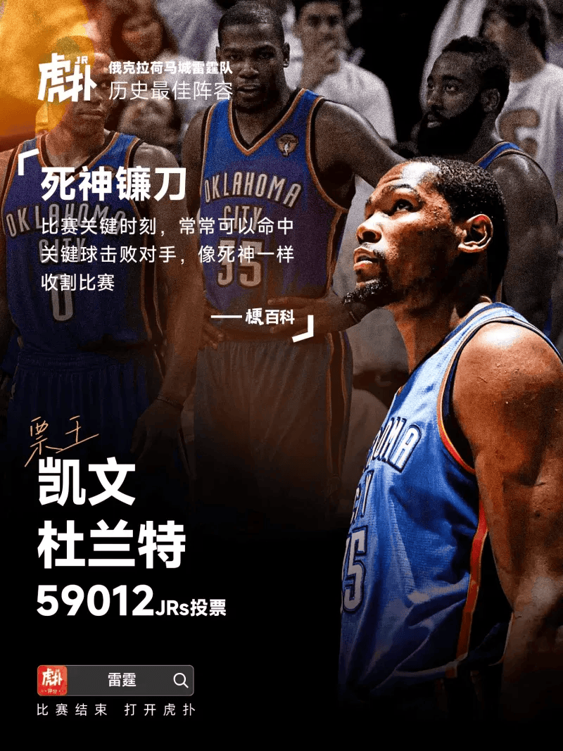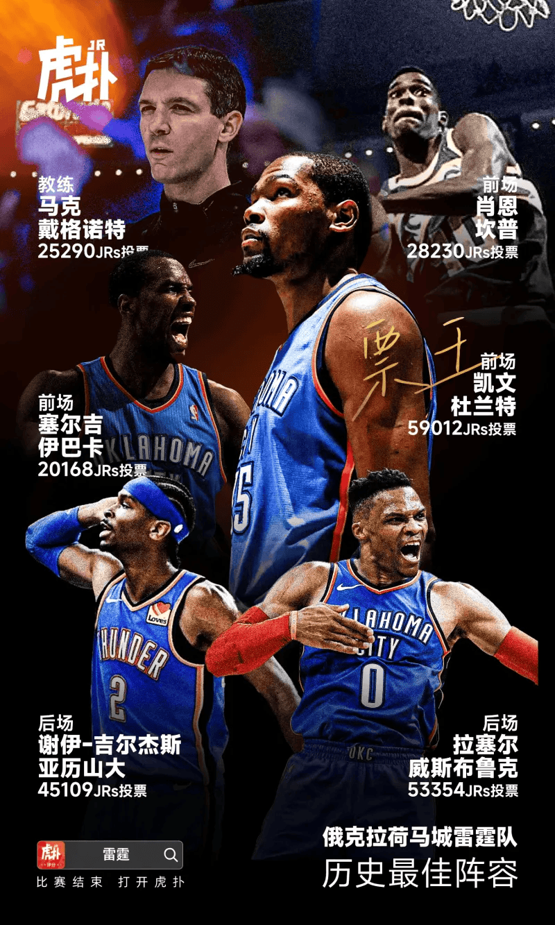 而在雷霆队史最佳阵容评选中,杜兰特则是成功拿下了票王的桂冠。这也体现了杜兰特对于雷霆这支球队的贡献以及其在雷霆球迷心中的地位——在雷霆效力的9年间,杜兰特常规赛场均可以得到27.4分7.0篮板3.7助攻,带队4次进入西部决赛,1次进入总决赛,个人更是7次进入全明星,获得4个得分王以及1个MVP。