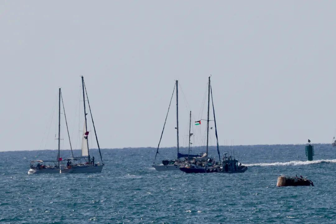 △10月2日,在以色列南部阿什杜德港附近,“全球坚韧船队”船只被拖向港口。
