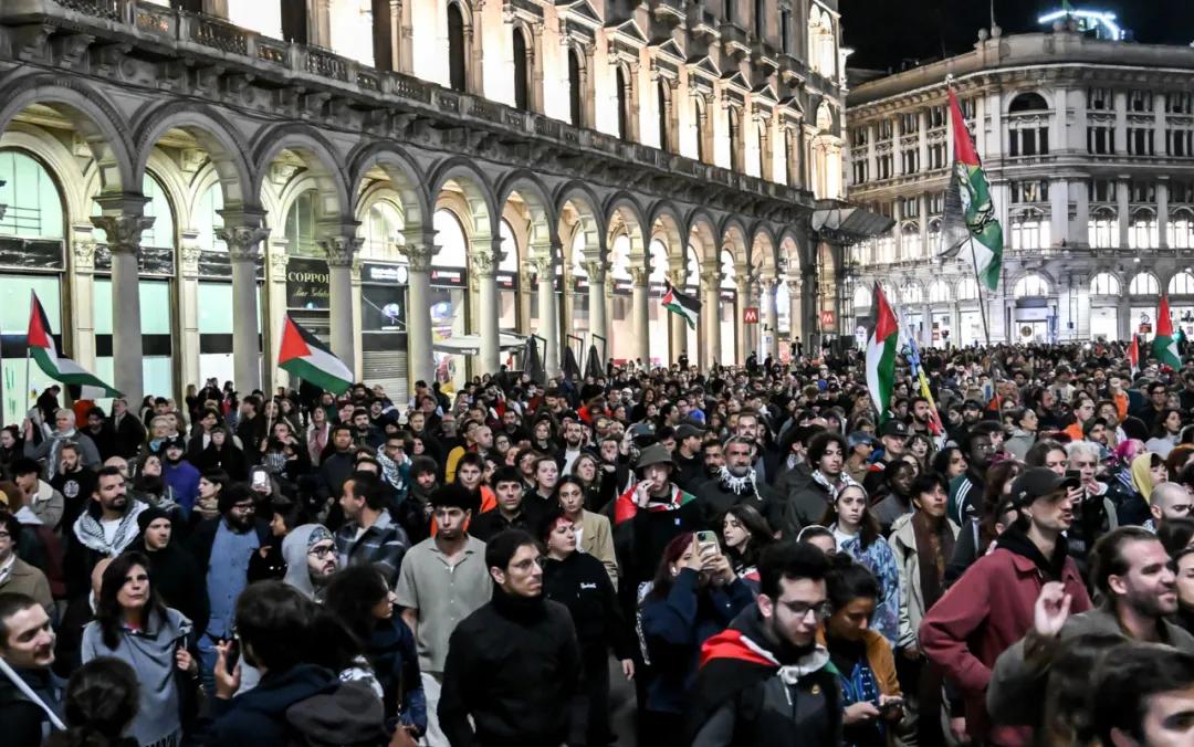 △10月1日,人们在意大利米兰大教堂广场示威游行,抗议以色列拦截加沙援助船队。