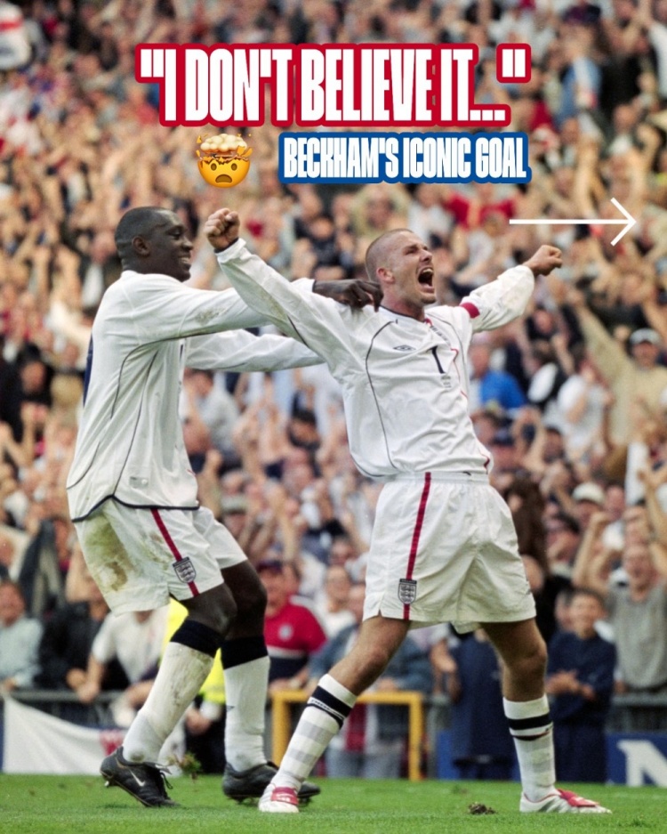 2001年的今天,英格兰在世预赛欧洲区最后一轮比赛中主场对阵希腊,贝克汉姆顶住巨大压力在第93分钟任意球直接破门,帮助英格兰2-2绝平希腊,获得2002年世界杯决赛圈参赛资格。